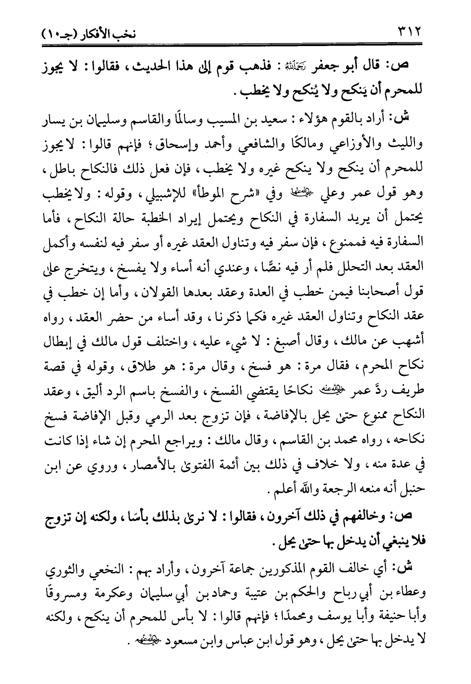 ش: أراد بالقوم هؤلاء: سعيد بن المسيب وسالمًا والقاسم وسليمان بن يسار والليث والأوزاعي ومالكًا والشافعي وأحمد وإسحاق؛ فإنهم قالوا: لا يجوز للمحرم أن ينكح ولا ينكح غيره ولا يخطب، فإن فعل ذلك فالنكاح باطل، وهو قول عمر وعلي -رضي الله عنهما- وفي "شرح الموطأ" للإِشبيلي، وقوله: ولا يخطب يحتمل أن يريد السفارة في النكاح ويحتمل إيراد الخطبة حالة النكاح، فأما السفارة فيه فممنوع، فإن سفر فيه وتناول العقد غيره أو سفر فيه لنفسه وأكمل العقد بعد التحلل فلم أر فيه نصًّا، وعندي أنه أساء ولا يفسخ، ويتخرج على قول أصحابنا فيمن خطب في العدة وعقد بعدها القولان، وأما إن خطب في عقد النكاح وتناول العقد غيره فكما ذكرنا، وقد أساء من حضر العقد، رواه أشهب عن مالك، وقال أصبغ: لا شيء عليه، واختلف قول مالك في إبطال نكاح المحرم، فقال مرة: هو فسخ، وقال مرة: هو طلاق، وقوله في قصة طريف ردَّ عمر -رضي الله عنه- نكاحًا يقتضي الفسخ، والفسخ باسم الرد أليق، وعقد النكاح ممنوع حتى يحل بالإِفاضة، فإن تزوج بعد الرمي وقبل الإِفاضة فسخ نكاحه، رواه محمد بن القاسم، وقال مالك: ويراجع المحرم إن شاء إذا كانت في عدة منه , ولا خلاف في ذلك بين أئمة الفتوى بالأمصار، وروي عن ابن حنبل أنه منعه الرجعة والله أعلم.
