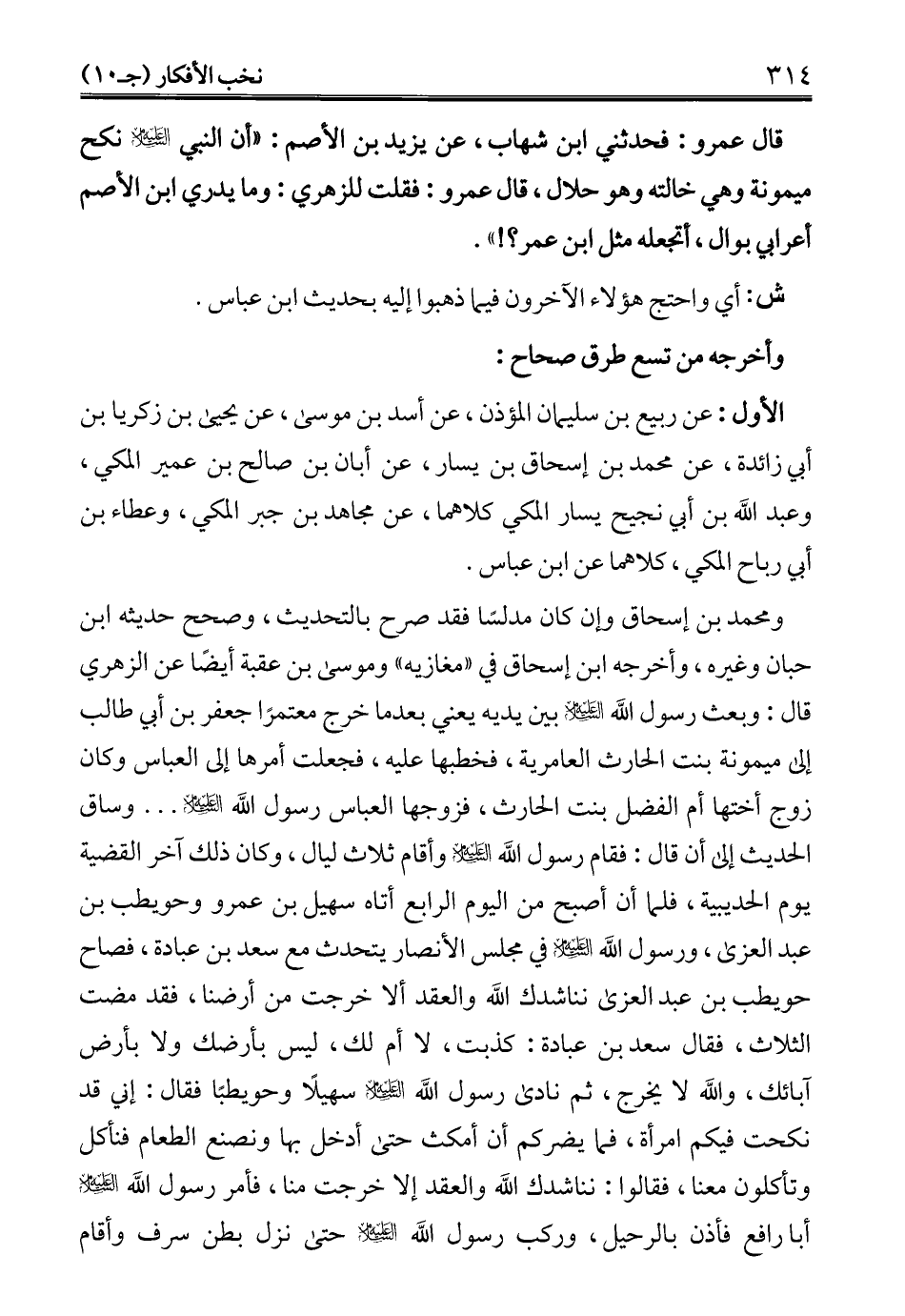 ومحمد بن إسحاق وإن كان مدلسًا فقد صرح بالتحديث، وصحح حديثه ابن حبان وغيره، وأخرجه ابن إسحاق في "مغازيه" وموسى بن عقبة أيضًا عن الزهري قال: وبعث رسول الله -عليه السلام- بين يديه يعني بعدما خرج معتمرًا جعفر بن أبي طالب إلى ميمونة بنت الحارث العامرية، فخطبها عليه، فجعلت أمرها إلى العباس وكان زوج أختها أم الفضل بنت الحارث، فزوجها العباس رسول الله -عليه السلام- ... وساق الحديث إلى أن قال: فقام رسول الله -عليه السلام- وأقام ثلاث ليال، وكان ذلك آخر القضية يوم الحديبية، فلما أن أصبح من اليوم الرابع أتاه سهيل بن عمرو وحويطب بن عبد العزى، ورسول الله -عليه السلام- في مجلس الأنصار يتحدث مع سعد بن عبادة، فصاح حويطب بن عبد العزى نناشدك الله والعقد ألا خرجت من أرضنا، فقد مضت الثلاث، فقال سعد بن عبادة: كذبت، لا أم لك، ليس بأرضك ولا بأرض آبائك، والله لا يخرج، ثم نادى رسول الله -عليه السلام- سهيلًا وحويطبًا فقال: إني قد نكحت فيكم امرأة، فما يضركم أن أمكث حتى أدخل بها ونصنع الطعام فنأكل وتأكلون معنا، فقالوا: نناشدك الله والعقد إلا خرجت منا، فأمر رسول الله -عليه السلام- أبارافع فأذن بالرحيل، وركب رسول الله -عليه السلام- حتى نزل بطن سرف وأقام