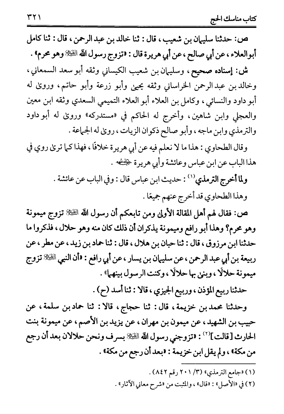 ص: حدثنا سليمان بن شعيب، قال: ثنا خالد بن عبد الرحمن، قال: ثنا كامل أبو العلاء، عن أبي صالح، عن أبي هريرة قال: "تزوج رسول الله -عليه السلام- وهو محرم".