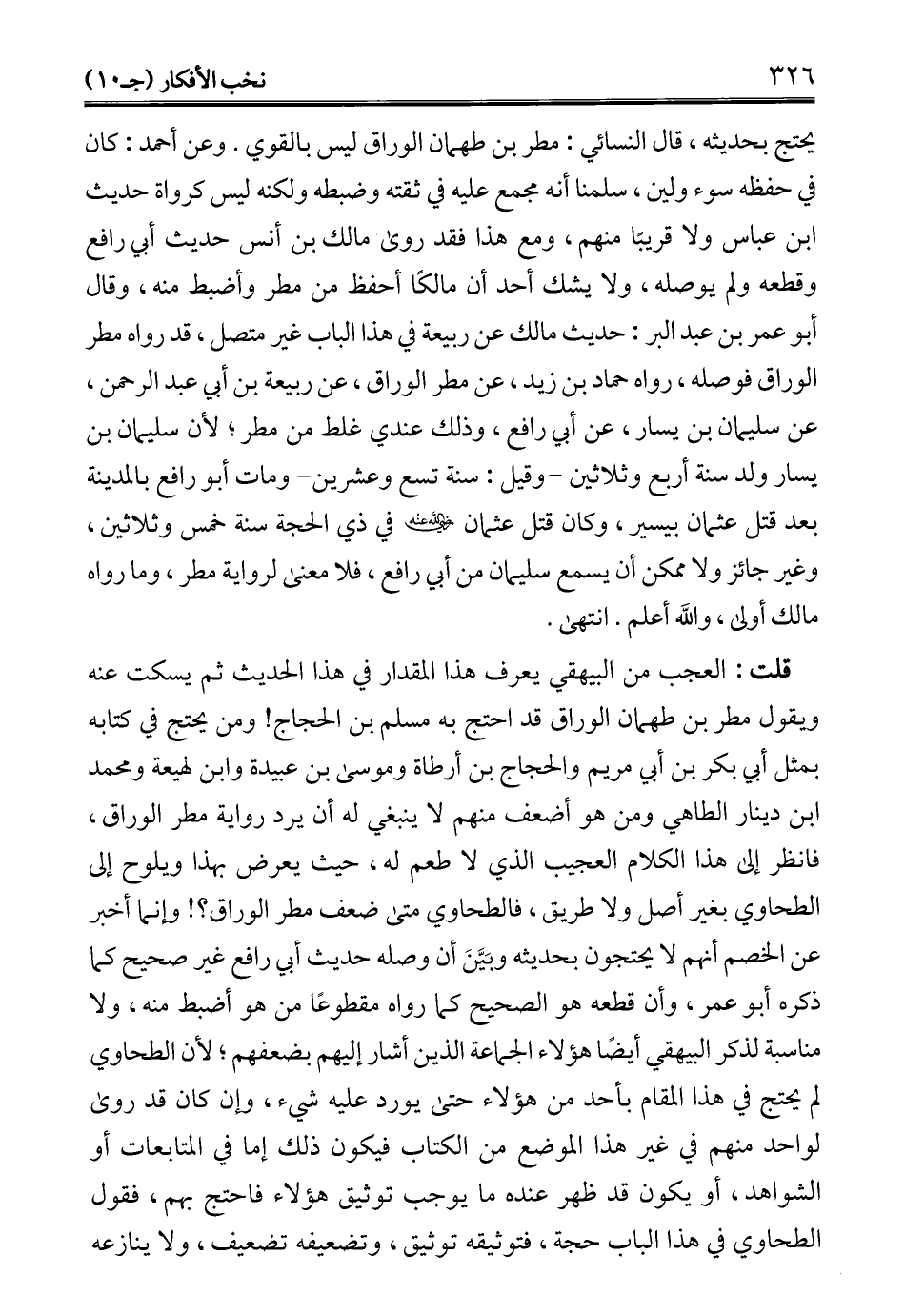 قلت: العجب من البيهقي يعرف هذا المقدار في هذا الحديث ثم يسكت عنه ويقول مطر بن طهمان الوراق قد احتج به مسلم بن الحجاج! ومن يحتج في كتابه بمثل أبي بكر بن أبي مريم والحجاج بن أرطاة وموسى بن عبيدة وابن لهيعة ومحمد ابن دينار الطاهي ومن هو أضعف منهم لا ينبغي له أن يرد رواية مطر الوراق، فانظر إلى هذا الكلام العجيب الذي لا طعم له، حيث يعرض بهذا ويلوح إلى الطحاوي بغير أصل ولا طريق، فالطحاوي متى ضعف مطر الوراق؟! وإنما أخبر عن الخصم أنهم لا يحتجون بحديثه وبَيَّنَ أن وصله حديث أبي رافع غير صحيح كما ذكره أبو عمر، وأن قطعه هو الصحيح كما رواه مقطوعًا من هو أضبط منه، ولا مناسبة لذكر البيهقي أيضًا هؤلاء الجماعة الذين أشار إليهم بضعفهم؛ لأن الطحاوي لم يحتج في هذا المقام بأحد من هؤلاء حتى يورد عليه شيء، وإن كان قد روى لواحد منهم في غير هذا الموضع من الكتاب فيكون ذلك إما في المتابعات أو الشواهد، أو يكون قد ظهر عنده ما يوجب توثيق هؤلاء فاحتج بهم، فقول الطحاوي في هذا الباب حجة، فتوثيقه توثيق، وتضعيفه تضعيف، ولا ينازعه