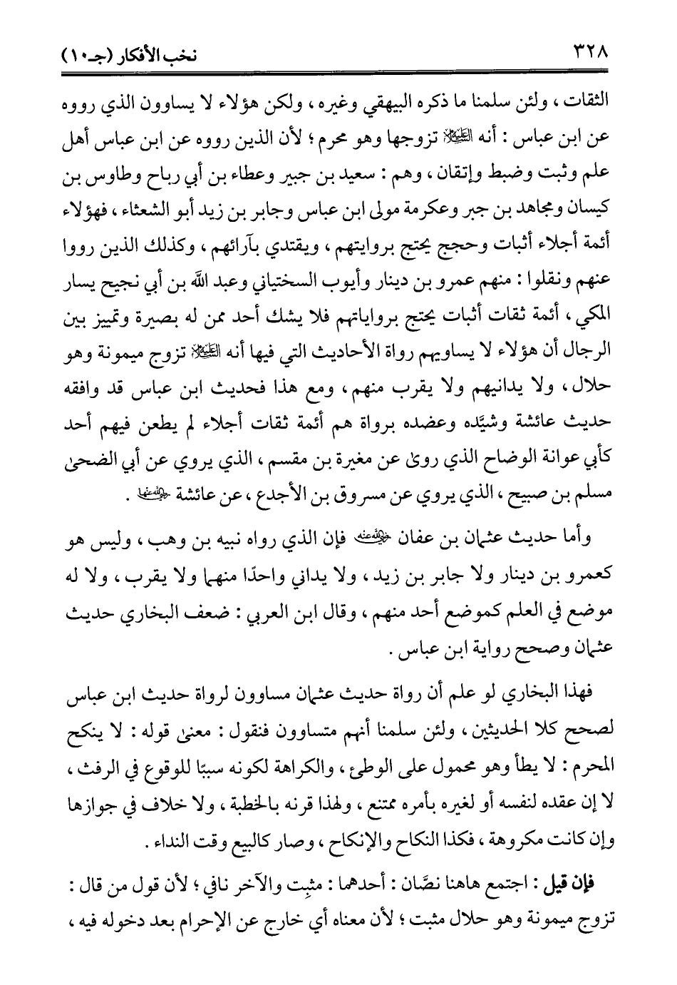 وأما حديث عثمان بن عفان -رضي الله عنه- فإن الذي رواه نبيه بن وهب، وليس هو كعمرو بن دينار ولا جابر بن زيد، ولا يداني واحدًا منهما ولا يقرب، ولا له موضع في العلم كموضع أحد منهم، وقال ابن العربي: ضعف البخاري حديث عثمان وصحح رواية ابن عباس.