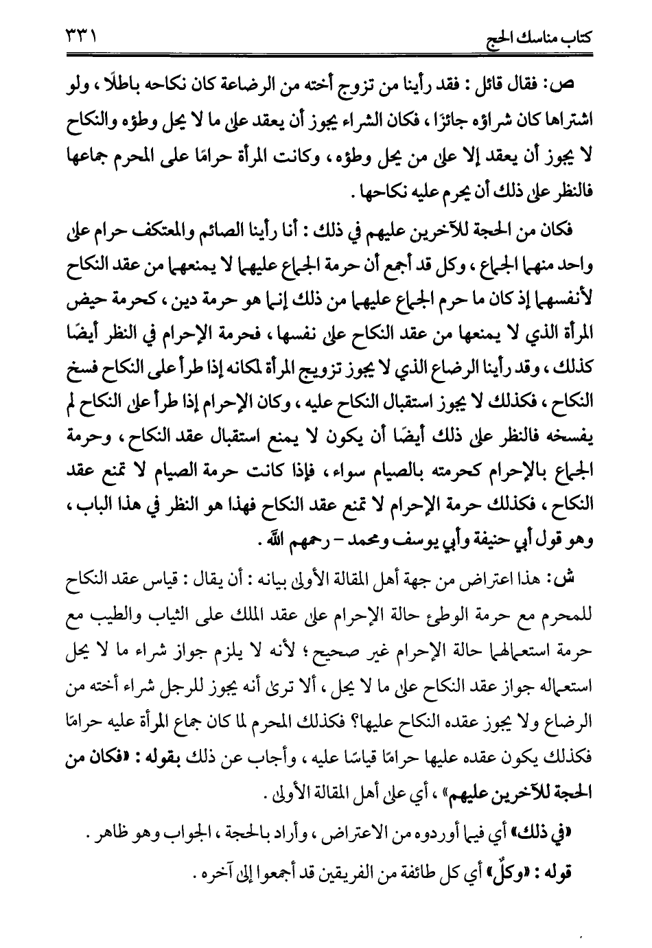 فكان من الحجة للآخرين عليهم في ذلك: أنا رأينا الصائم والمعتكف حرام على واحد منهما الجماع، وكل قد أجمع أن حرمة الجماع عليهما لا يمنعهما من عقد النكاح لأنفسهما إذ كان ما حرم الجماع عليهما من ذلك إنما هو حرمة دين، كحرمة حيض المرأة الذي لا يمنعها من عقد النكاح على نفسها، فحرمة الإِحرام في النظر أيضًا كذلك، وقد رأينا الرضاع الذي لا يجوز تزويج المرأة لمكانه إذا طرأ على النكاح فسخ النكاح، فكذلك لا يجوز استقبال النكاح عليه، وكان الإِحرام إذا طرأ على النكاح لم يفسخه فالنظر على ذلك أيضًا أن يكون لا يمنع استقبال عقد النكاح، وحرمة الجماع بالإِحرام كحرمته بالصيام سواء، فإذا كانت حرمة الصيام لا تمنع عقد النكاح، فكذلك حرمة الإِحرام لا تمنع عقد النكاح فهذا هو النظر في هذا الباب، وهو قول أبي حنيفة وأبي يوسف ومحمد -رحمهم الله-.