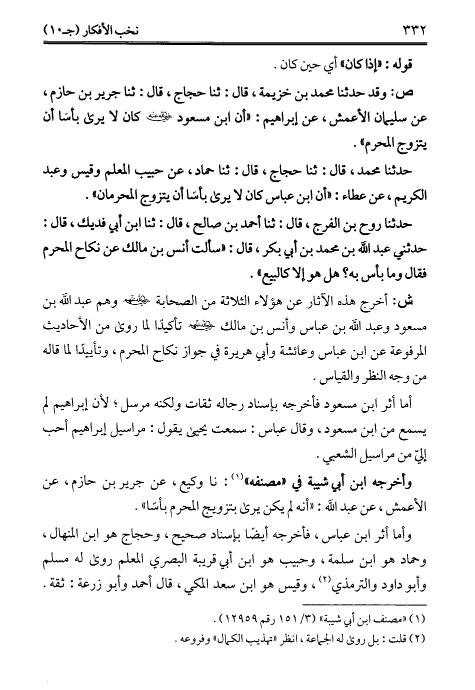 ص: وقد حدثنا محمد بن خزيمة، قال: ثنا حجاج، قال: ثنا جرير بن حازم، عن سليمان الأعمش، عن إبراهيم: "أن ابن مسعود -رضي الله عنه- كان لا يرى بأسًا أن يتزوج المحرم".
