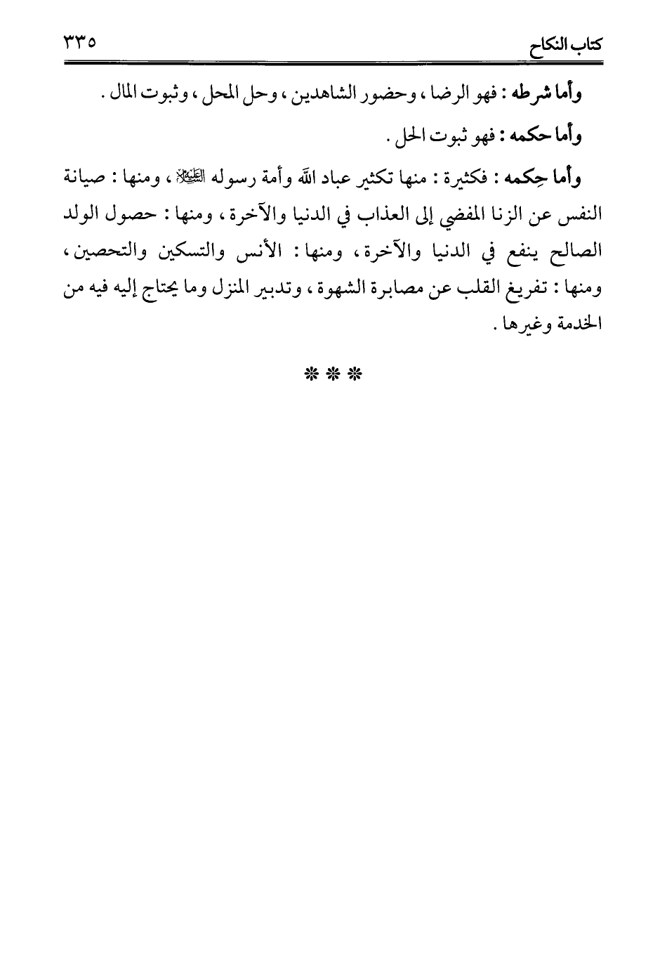 وأما حِكمه: فكثيرة: منها تكثير عباد الله وأمة رسوله -عليه السلام-، ومنها: صيانة النفس عن الزنا المفضي إلى العذاب في الدنيا والآخرة، ومنها: حصول الولد الصالح ينفع في الدنيا والآخرة، ومنها: الأنس والتسكين والتحصين، ومنها: تفريغ القلب عن مصابرة الشهوة، وتدبير المنزل وما يحتاج إليه فيه من الخدمة وغيرها.