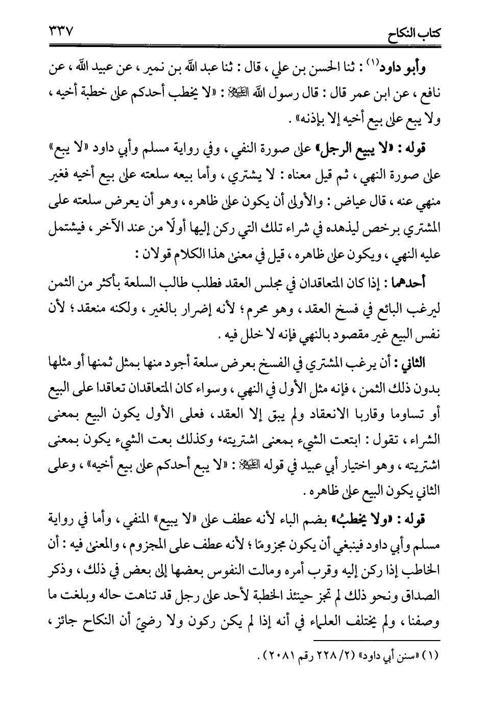 وأبو داود (¬1): ثنا الحسن بن علي، قال: ثنا عبد الله بن نمير، عن عبيد الله، عن نافع، عن ابن عمر قال: قال رسول الله -عليه السلام-: "لا يخطب أحدكم على خطبة أخيه، ولا يبع على بيع أخيه إلا بإذنه".