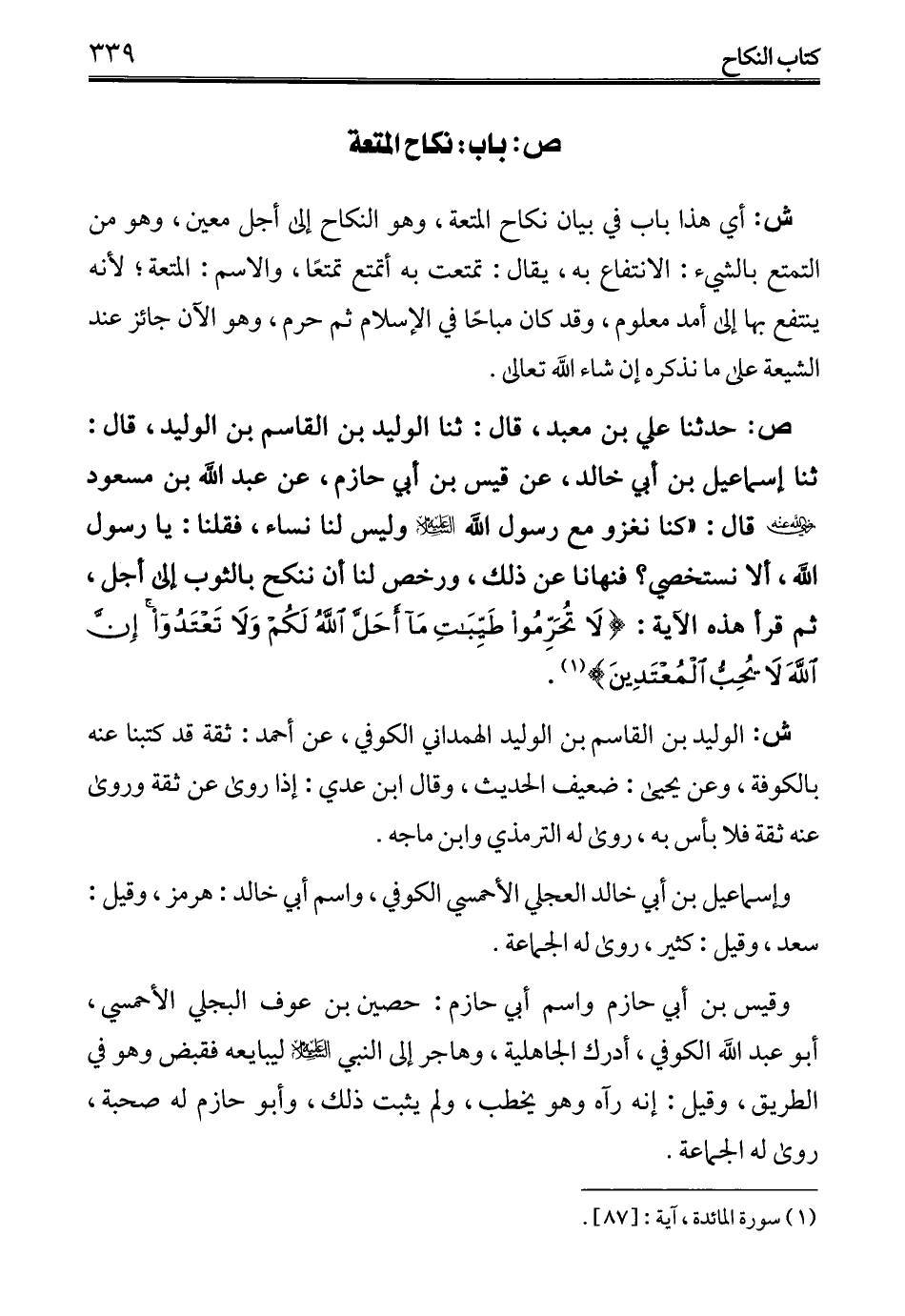 ص: حدثنا علي بن معبد، قال: ثنا الوليد بن القاسم بن الوليد، قال: ثنا إسماعيل بن أبي خالد، عن قيس بن أبي حازم، عن عبد الله بن مسعود -رضي الله عنه- قال: "كنا نغزو مع رسول الله -عليه السلام- وليس لنا نساء، فقلنا: يا رسول الله، ألا نستخصي؟ فنهانا عن ذلك، ورخص لنا أن ننكح بالثوب إلى أجل، ثم قرأ هذه الآية: {يَا أَيُّهَا الَّذِينَ آمَنُوا لَا تُحَرِّمُوا طَيِّبَاتِ مَا أَحَلَّ اللَّهُ لَكُمْ وَلَا تَعْتَدُوا إِنَّ اللَّهَ لَا يُحِبُّ الْمُعْتَدِينَ} (¬1).
