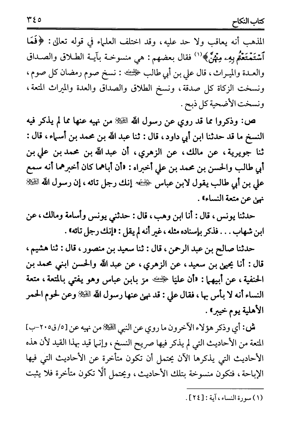 حدثنا صالح بن عبد الرحمن، قال: ثنا سعيد بن منصور، قال: ثنا هشيم، قال: أنا يحيى بن سعيد، عن الزهري، عن عبد الله والحسن ابني محمد بن الحنفية، عن أبيهما: "أن عليًا -رضي الله عنه- مرّ بابن عباس وهو يفتي بالمتعة، متعة النساء أنه لا بأس بها، فقال علي: قد نهى عنها رسول الله -عليه السلام- وعن لحوم الحمر الأهلية يوم خيبر".
