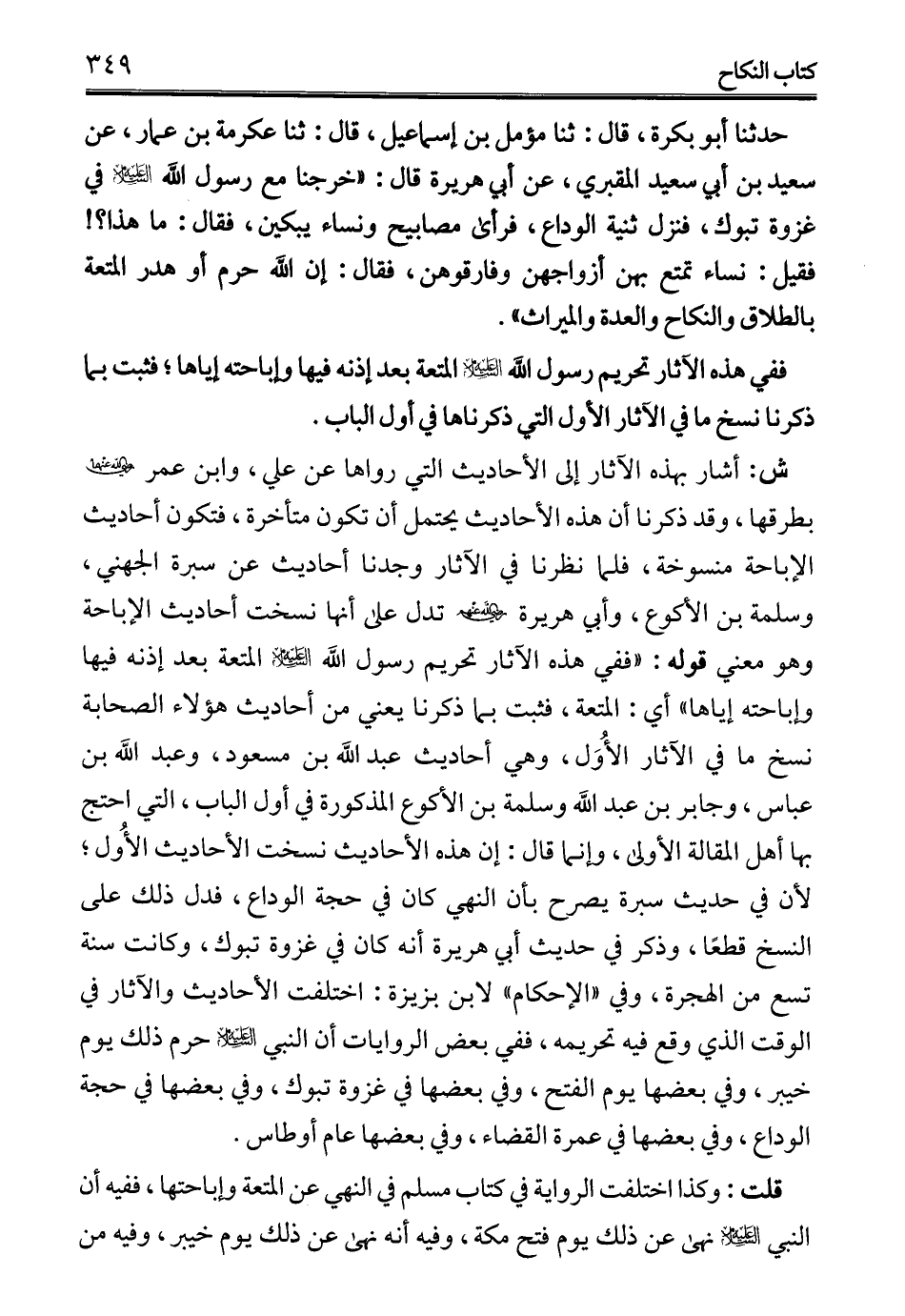 حدثنا أبو بكرة، قال: ثنا مؤمل بن إسماعيل، قال: ثنا عكرمة بن عمار، عن سعيد بن أبي سعيد المقبري، عن أبي هريرة قال: "خرجنا مع رسول الله -عليه السلام- في غزوة تبوك، فنزل ثنية الوداع، فرأى مصابيح ونساء يبكين، فقال: ما هذا؟! فقيل: نساء تمتع بهن أزواجهن وفارقوهن، فقال: إن الله حرم أو هدر المتعة بالطلاق والنكاح والعدة والميراث".