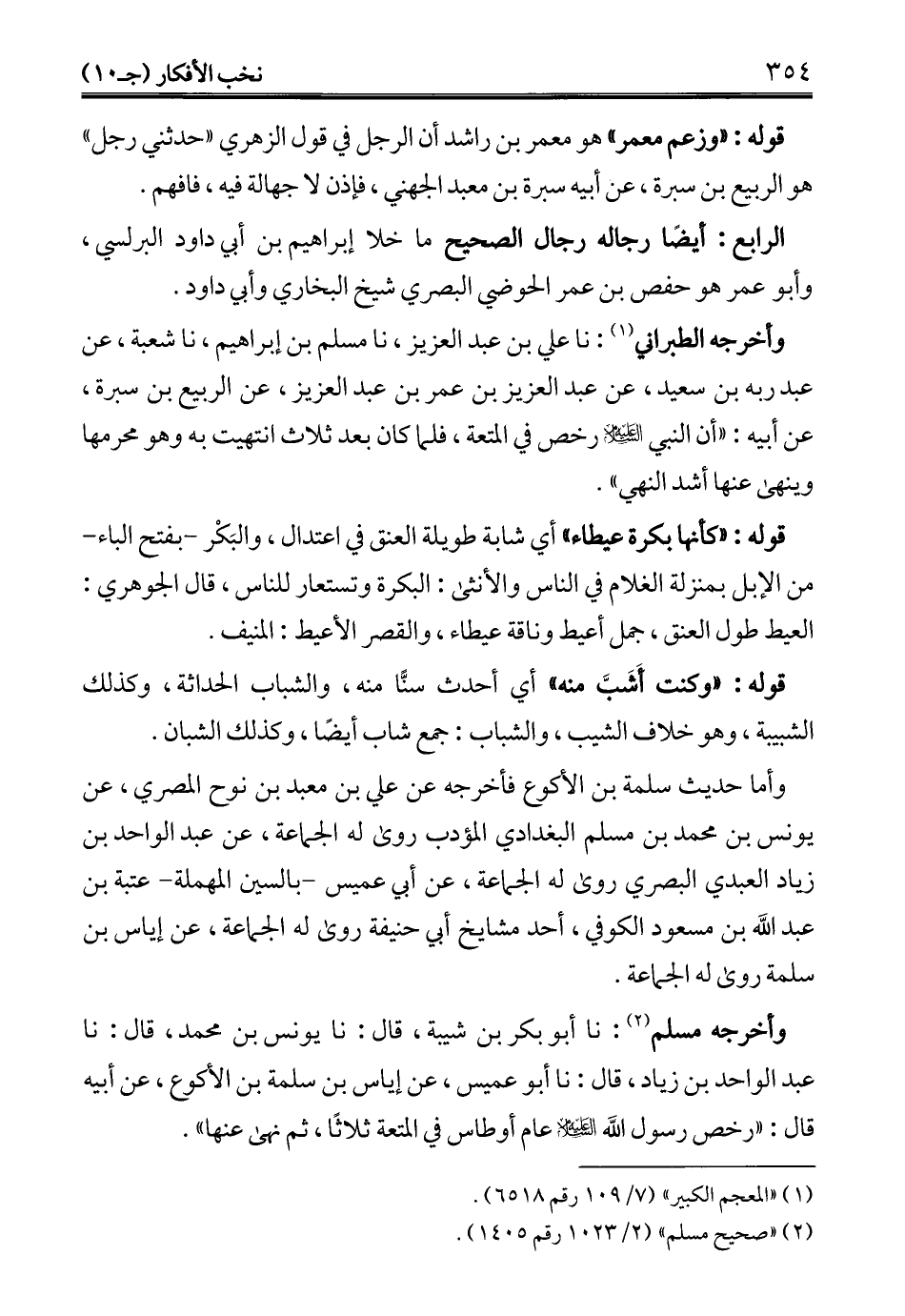 وأخرجه الطبراني (¬1): نا علي بن عبد العزيز، نا مسلم بن إبراهيم، نا شعبة، عن عبد ربه بن سعيد، عن عبد العزيز بن عمر بن عبد العزيز، عن الربيع بن سبرة، عن أبيه: "أن النبي -عليه السلام- رخص في المتعة، فلما كان بعد ثلاث انتهيت به وهو محرمها وينهى عنها أشد النهي".