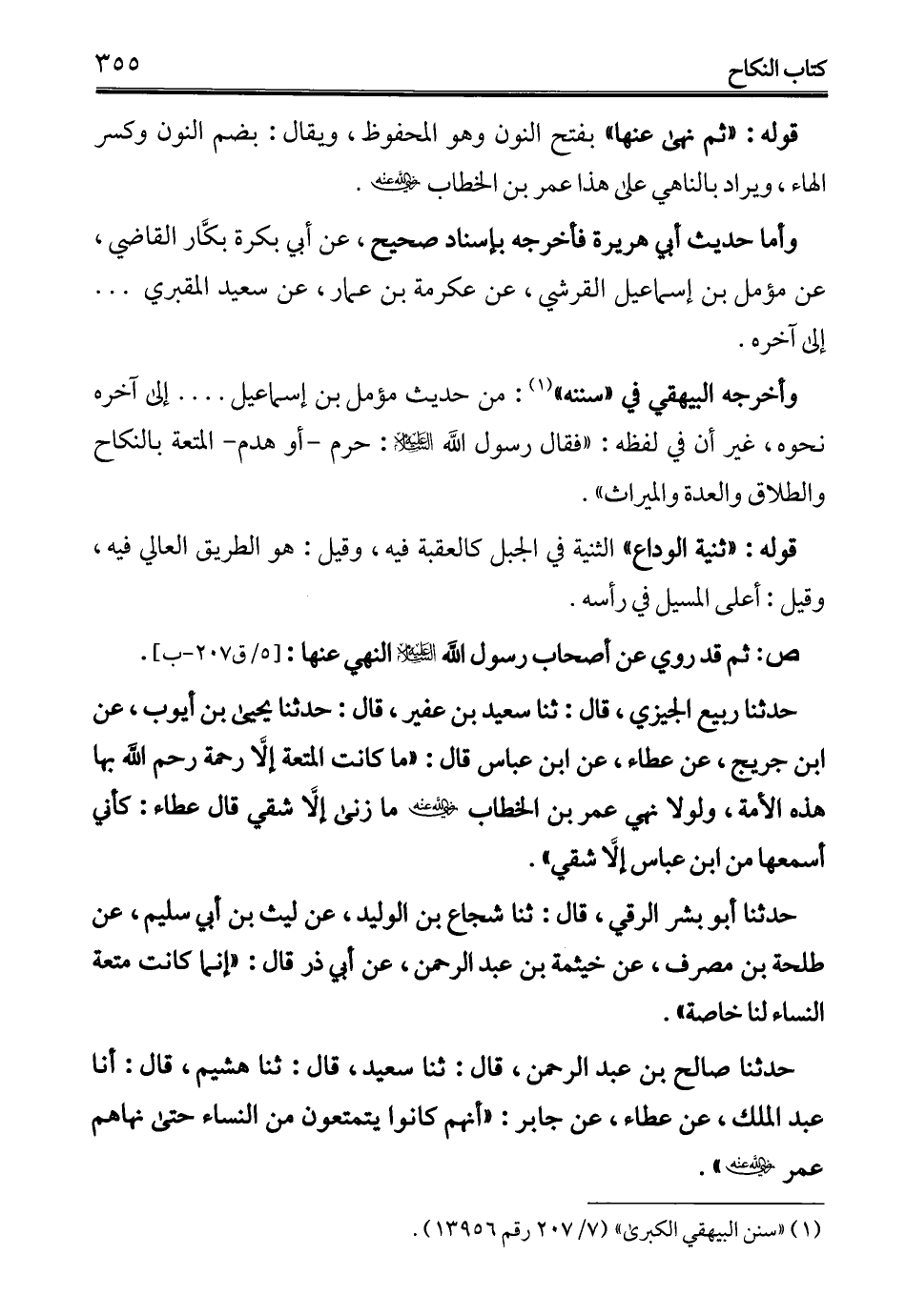 حدثنا صالح بن عبد الرحمن، قال: ثنا سعيد، قال: ثنا هشيم، قال: أنا عبد الملك، عن عطاء، عن جابر: "أنهم كانوا يتمتعون من النساء حتى نهاهم عمر -رضي الله عنه-".