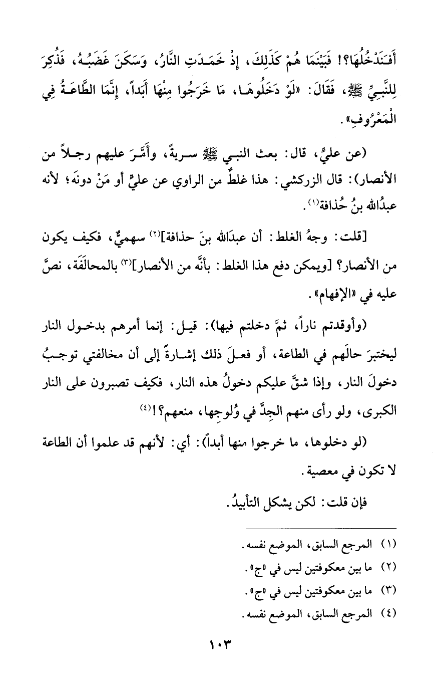 (عن عليٍّ، قال: بعث النبي - صلى الله عليه وسلم - سريةً، وأَمَّرَ عليهم رجلًا من الأنصار): قال الزركشي: هذا غلطٌ من الراوي عن عليًّ أو مَنْ دونَه؛ لأنه عبدُ الله بنُ حُذافة (¬1).