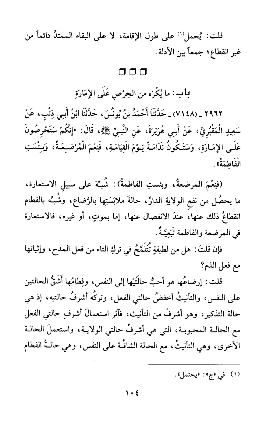 2962 - (7148) - حَدَّثَنَا أَحْمَدُ بْنُ يُونُسَ، حَدَّثَنَا ابْنُ أَبِي ذِئْبٍ، عَنْ سَعِيدٍ الْمَقْبُرِيِّ، عَنْ أَبِي هُرَيْرَةَ، عَنِ النَّبِيِّ - صلى الله عليه وسلم -، قَالَ: "إِنَّكُمْ سَتَحْرِصُونَ عَلَى الإِمَارَةِ، وَسَتَكُونُ نَدَامَةً يَوْمَ الْقِيَامَةِ، فَنِعْمَ الْمُرْضِعَةُ، وَبِئْسَتِ الْفَاطِمَةُ".