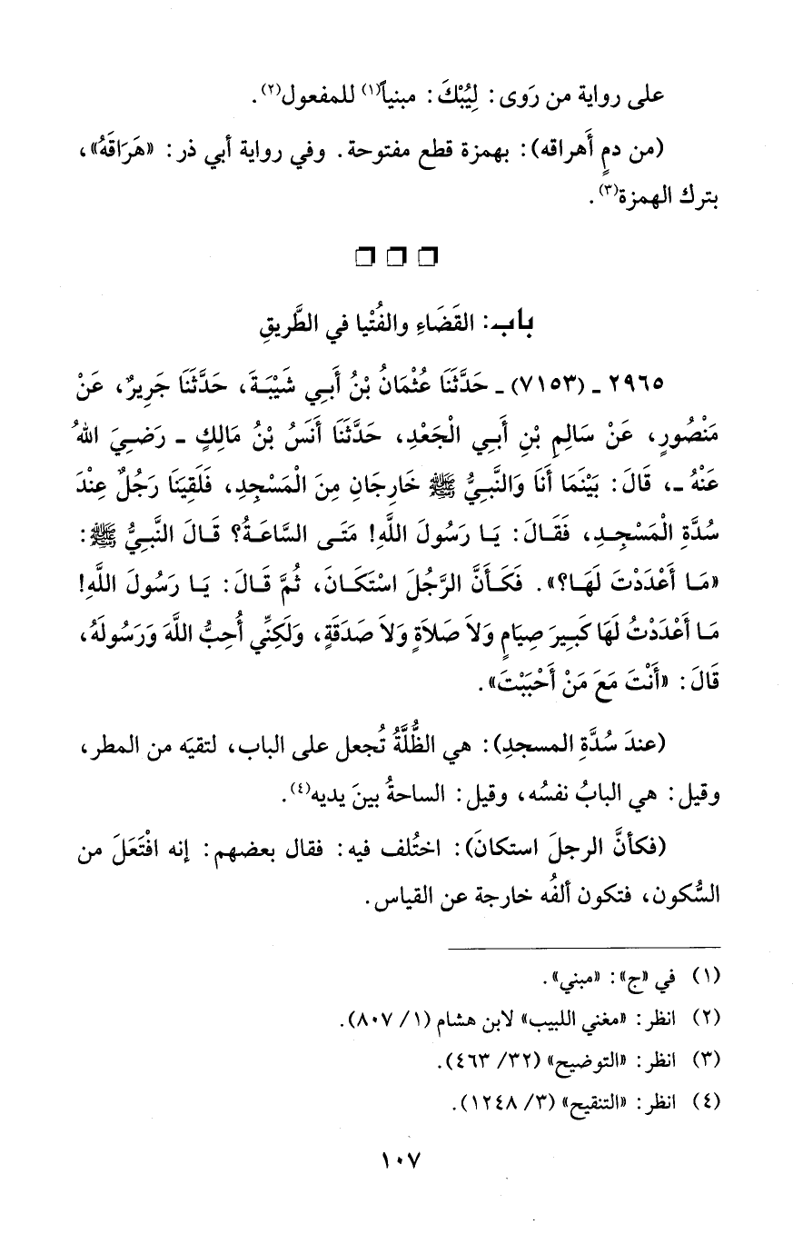 2965 - (7153) - حَدَّثَنَا عُثْمَانُ بْنُ أَبِي شَيْبَةَ، حَدَّثَنَا جَرِيرٌ، عَنْ مَنْصُورٍ، عَنْ سَالِم بْنِ أَبِي الْجَعْدِ، حَدَّثَنَا أَنسُ بْنُ مَالِكٍ - رَضِيَ اللهُ عَنْهُ -، قَالَ: بَيْنَمَا أَناَ وَالنَّبِيُّ - صلى الله عليه وسلم - خارِجَانِ مِنَ الْمَسْجدِ، فَلَقِيَنَا رَجُلٌ عِنْدَ سُدَّةِ الْمَسْجِدِ، فَقَالَ: يَا رَسُولَ اللَّهِ! مَتَى السَّاعَةُ؟ قَالَ النَّبِيُّ - صلى الله عليه وسلم -: "مَا أَعْدَدْتَ لَهَا؟ ". فَكَأَنَّ الرَّجُلَ اسْتَكَانَ، ثُمَّ قَالَ: يَا رَسُولَ اللَّهِ! مَا أَعْدَدْتُ لَهَا كَبِيرَ صِيَامٍ وَلاَ صَلاَةٍ وَلاَ صَدَقَةٍ، وَلَكِنِّي أُحِبُّ اللَّهَ وَرَسُولَهُ، قَالَ: "أَنْتَ مَعَ مَنْ أَحْبَبْتَ".
