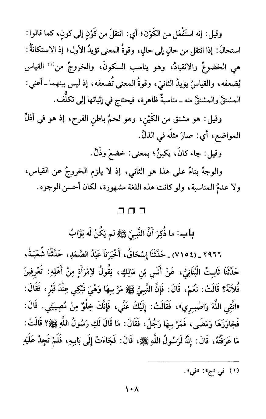 2966 - (7154) - حَدَّثَنَا إِسْحَاقُ، أَخْبَرَنَا عَبْدُ الصَّمَدِ، حَدَّثَنَا شُعْبَةُ، حَدَّثَنَا ثَابِث الْبُنَانِيُّ، عَنْ أَنَسِ بْنِ مَالِكٍ، يَقُولُ لاِمْرَأَةٍ مِنْ أَهْلِهِ: تَعْرِفِينَ فُلاَنَةَ؟ قَالَتْ: نَعَمْ، قَالَ: فَإِنَّ النَّبِيَّ - صلى الله عليه وسلم - مَرَّ بِهَا وَهْيَ تَبْكِي عِنْدَ قَبْرٍ، فَقَالَ: "اتَّقِي اللَّهَ وَاصْبِرِي"، فَقَالَتْ: إِلَيْكَ عَنِّي، فَإِنَّكَ خِلْوٌ مِنْ مُصِيبَتِي. قَالَ: فَجَاوَزَهَا وَمَضَى، فَمَرَّ بِهَا رَجُلٌ، فَقَالَ: مَا قَالَ لَكِ رَسُولُ اللهِ - صلى الله عليه وسلم -؟ قَالَتْ: مَا عَرَفْتُهُ، قَالَ: إِنَّهُ لَرَسُولُ اللَّهِ - صلى الله عليه وسلم -، قَالَ: فَجَاءَتْ إِلَى بَابِهِ، فَلَمْ تَجِدْ عَلَيْهِ