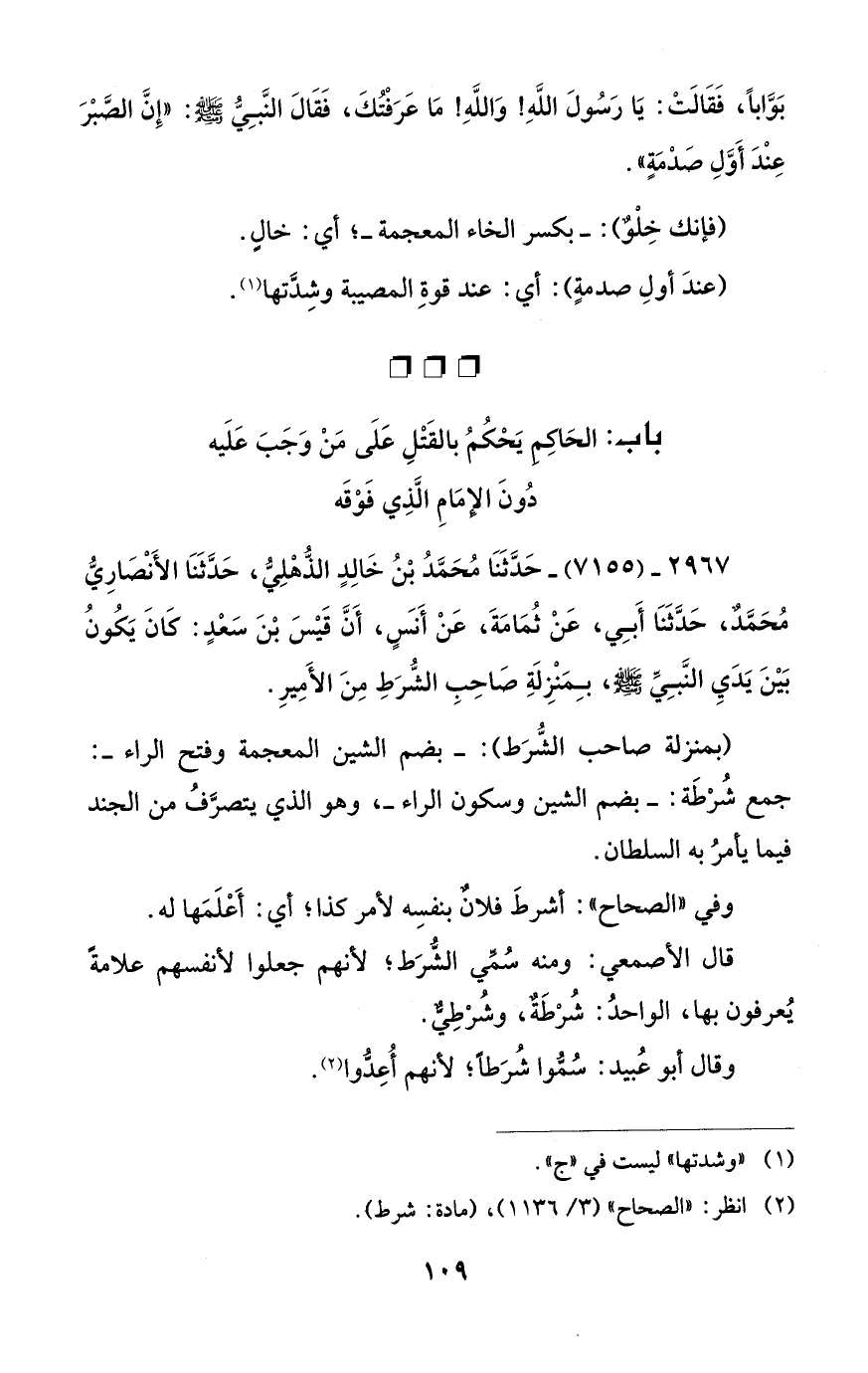 (بمنزلة صاحب الشُّرَط): - بضم الشين المعجمة وفتح الراء -: جمع شُرْطَة: - بضم الشين وسكون الراء -، وهو الذي يتصرَّفُ من الجند فيما يأمرُ به السلطان.