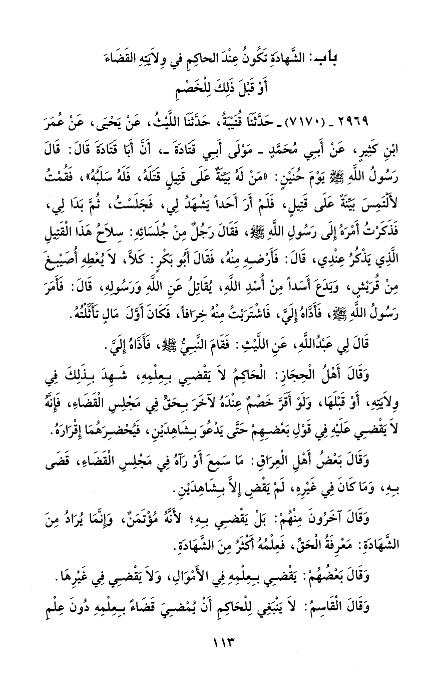 2969 - (7170) - حَدَّثَنَا قُتَيْبَةُ، حَدَّثَنَا اللَّيْثُ، عَنْ يَحْيَى، عَنْ عُمَرَ ابْنِ كَثِيرٍ، عَنْ أَبِي مُحَمَّدٍ - مَوْلَى أَبِي قَتَادَةَ -، أنَّ أَبَا قتادَةَ قَالَ: قَالَ رَسُولُ اللَّهِ - صلى الله عليه وسلم - يوْمَ حُنَيْنٍ: "مَنْ لَهُ بَيِّنَةٌ عَلَى قَتِيلٍ قَتَلَهُ، فَلَهُ سَلَبُهُ"، فَقُمْتُ لأَلْتَمِسَ بَيِّنَةً عَلَى قَتِيلٍ، فَلَمْ أَرَ أَحَداً يَشْهَدُ لِي، فَجَلَسْتُ، ثُمَّ بَدَا لِي، فَذَكَرْتُ أَمْرَهُ إِلَى رَسُولِ اللَّهِ - صلى الله عليه وسلم -، فَقَالَ رَجُلٌ مِنْ جُلَسَائِهِ: سِلاَحُ هَذَا الْقَتِيلِ الَّذِي يَذْكُرُ عِنْدِي، قَالَ: فَأَرْضِهِ مِنْهُ، فَقَالَ أبُو بَكْرٍ: كلَّا، لاَ يُعْطِهِ أُصَيْبِغَ مِنْ قُرَيْشٍ، وَيَدَعَ أَسَداً مِنْ أُسْدِ اللَّهِ، يُقَاتِلُ عَنِ اللَّهِ وَرَسُولِهِ، قَالَ: فَأَمَرَ رَسُولُ اللَّهِ - صلى الله عليه وسلم -، فَأَدَّاهُ إِلَيَّ، فَاشْتَرَيْتُ مِنْهُ خِرَافاً، فَكَانَ أَوَّلَ مَالٍ تَأَثَّلْتُهُ.