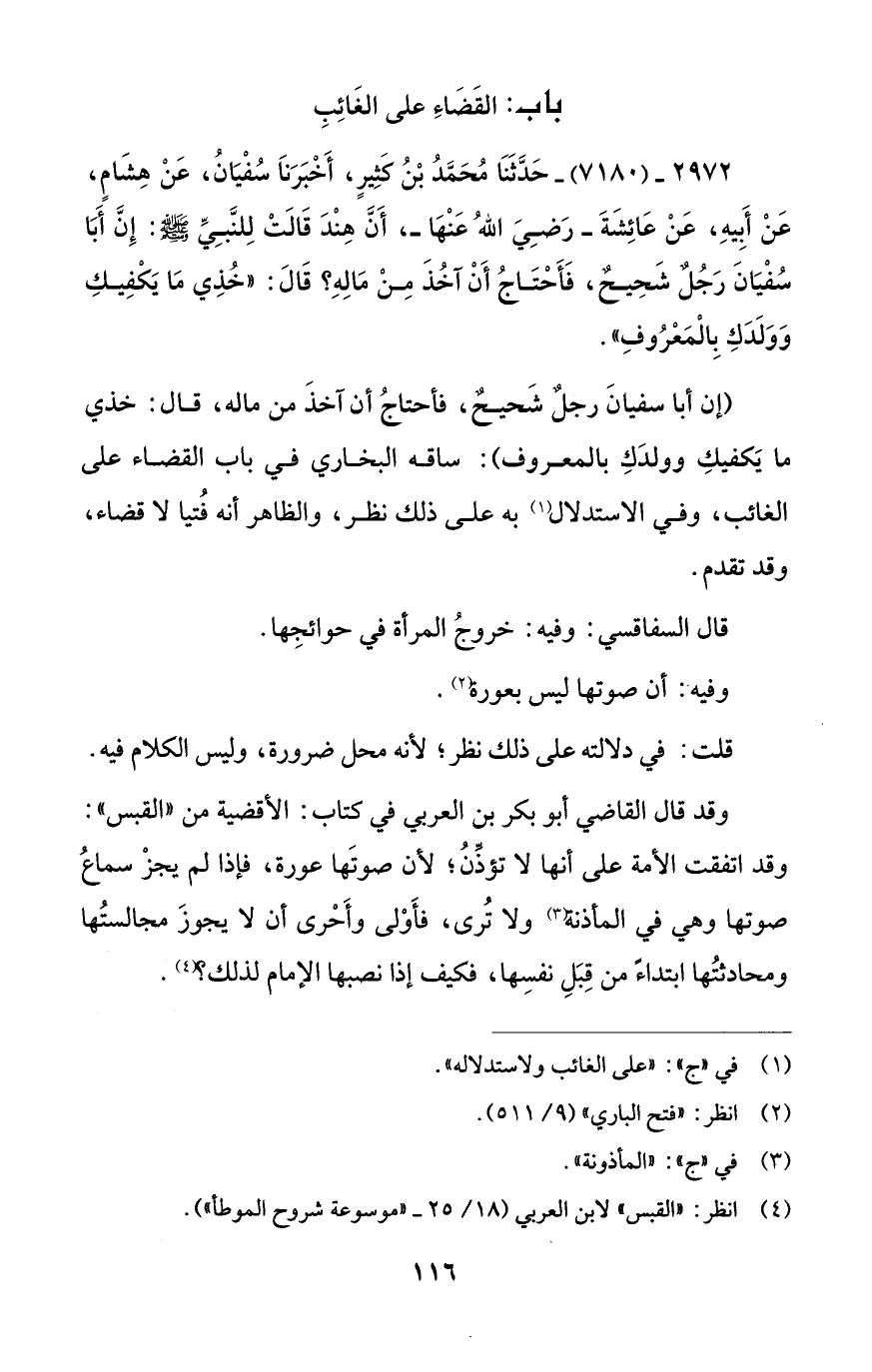 2972 - (7180) - حَدَّثَنَا مُحَمَّدُ بْنُ كَثِيرٍ، أَخْبَرَنَا سُفْيَانُ، عَنْ هِشَامٍ، عَنْ أَبيهِ، عَنْ عَائِشَةَ - رَضِيَ اللهُ عَنْهَا -، أَنَّ هِنْدَ قَالَتْ لِلنَّبِيِّ - صلى الله عليه وسلم -: إِنَّ أَبَا سُفْيَانَ رَجُلٌ شَحِيحٌ، فَأَحْتَاجُ أَنْ آخُذَ مِنْ مَالِهِ؟ قَالَ: "خُذِي مَا يَكْفِيكِ وَوَلَدَكِ بِالْمَعْرُوفِ".