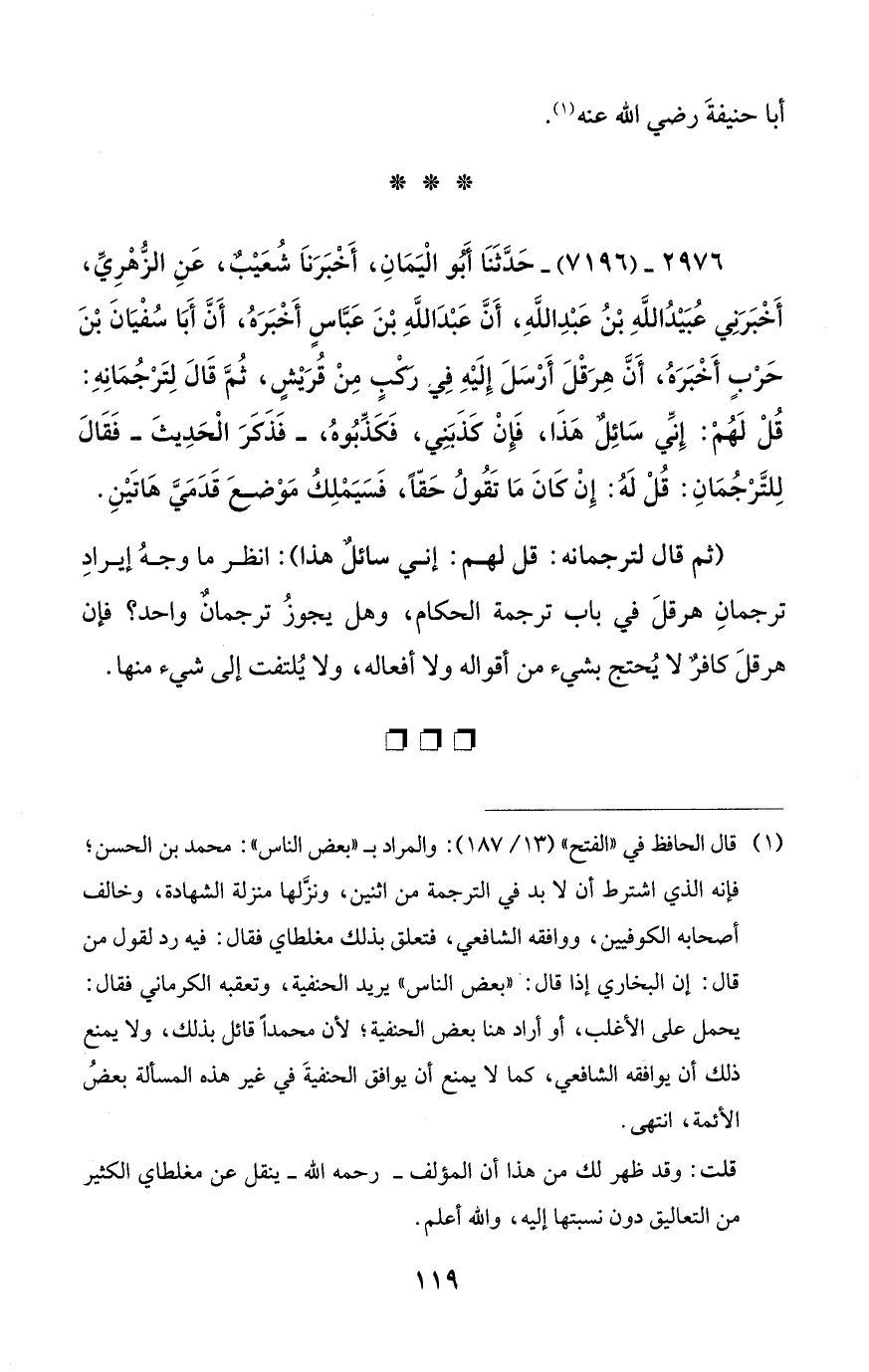 (ثم قال لترجمانه: قل لهم: إني سائلٌ هذا): انظر ما وجهُ إيرادِ ترجمانِ هرقلَ في باب ترجمة الحكام، وهل يجوزُ ترجمانٌ واحد؟ فإن هرقلَ كافرٌ لا يُحتج بشيء من أقواله ولا أفعاله، ولا يُلتفت إلى شيء منها.