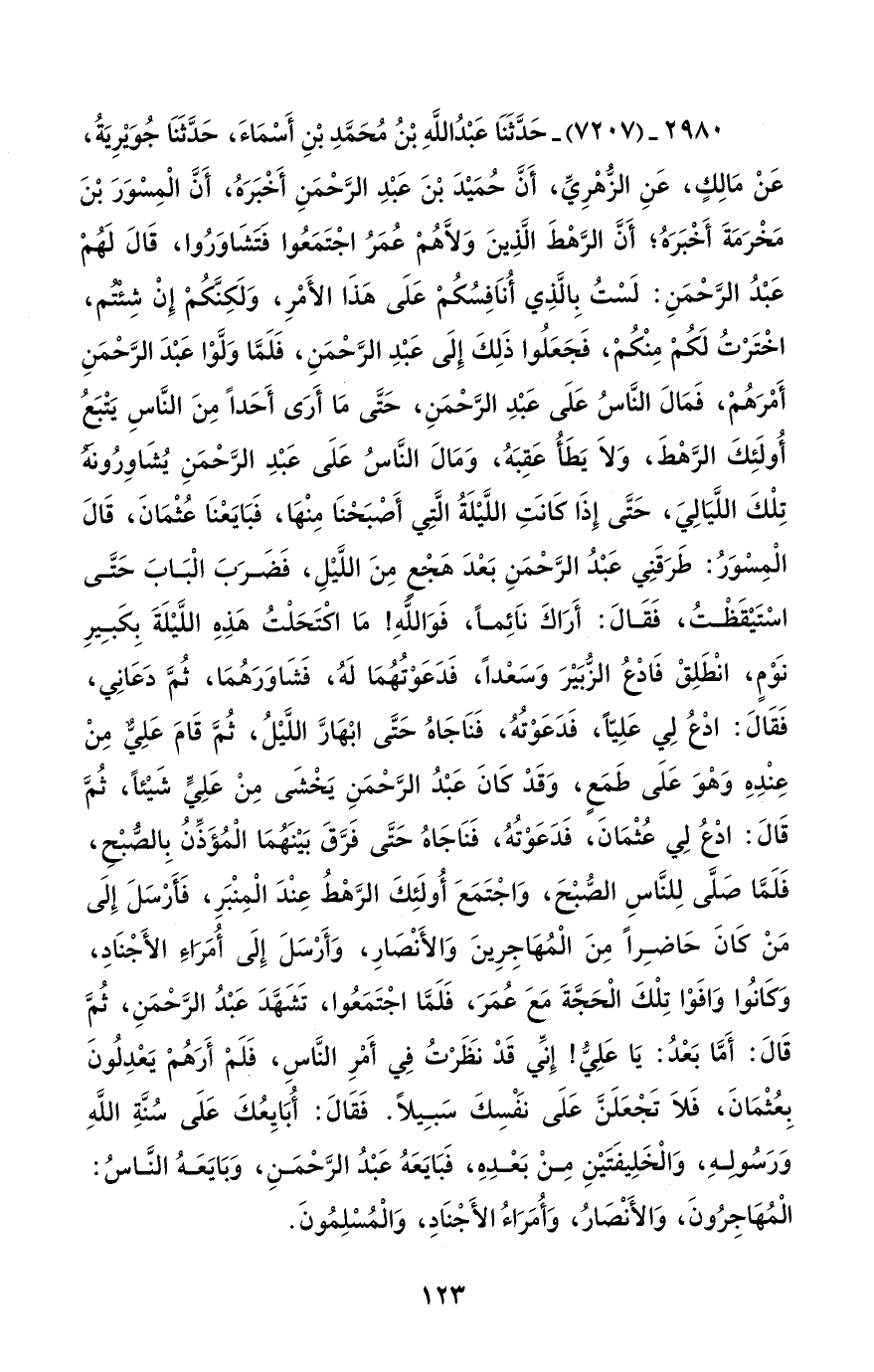 2980 - (7207) - حَدَّثَنَا عَبْدُ اللَّهِ بْنُ مُحَمَّدِ بْنِ أَسْمَاءَ، حَدَّثَنَا جُوَيْرِيَةُ، عَنْ مَالِكٍ، عَنِ الزُّهْرِيِّ، أَنَّ حُمَيْدَ بْنَ عَبْدِ الرَّحْمَنِ أخبَرَهُ، أَنَّ الْمِسْوَرَ بْنَ مَخْرَمَةَ أَخْبَرَهُ؛ أَنَّ الرَّهْطَ الَّذِينَ وَلَّاهُمْ عُمَرُ اجْتَمَعُوا فتشَاوَرُوا، قَالَ لَهُمْ عَبْدُ الرَّحْمَنِ: لَسْتُ بِالَّذِي أُنَافِسُكُمْ عَلَى هَذَا الأَمْرِ، وَلَكِنَّكُمْ إِنْ شِئْتُم، اخْتَرْتُ لَكُمْ مِنْكُمْ، فَجَعَلُوا ذَلِكَ إِلَى عَبْدِ الرَّحْمَنِ، فَلَمَّا وَلَّوْا عَبْدَ الرَّحْمَنِ أَمْرَهُمْ، فَمَالَ النَّاسُ عَلَى عَبْدِ الرَّحْمَنِ، حَتَّى مَا أَرَى أَحَداً مِنَ النَّاسِ يَتْبَعُ أُولَئِكَ الرَّهْطَ، وَلاَ يَطَأُ عَقِبَهُ، وَمَالَ النَّاسُ عَلَى عَبْدِ الرَّحْمَنِ يُشَاوِرُونَهُ تِلْكَ اللَّيَالِيَ، حَتَّى إِذَا كانَتِ اللَّيْلَةُ الَّتِي أَصْبَحْنَا مِنْهَا، فَبَايَعْنَا عُثْمَانَ، قَالَ الْمِسْوَرُ: طَرَقَنِي عَبْدُ الرَّحْمَنِ بَعْدَ هَجْع مِنَ اللَّيْلِ، فَضَرَبَ الْبَابَ حَتَّى اسْتَيْقَظْتُ، فَقَالَ: أَرَاكَ ناَئِماً، فَوَاللهِ! مَا اكتَحَلْتُ هَذِهِ اللَّيْلَةَ بِكَبِيرِ نَوْمٍ، انْطَلِقْ فَادْعُ الزُّبَيْرَ وَسَعْداً، فَدَعَوْتُهُمَا لَهُ، فَشَاوَرَهُمَا، ثُمَّ دَعَانِي، فَقَالَ: ادْعُ لِي عَلِيّاً، فَدَعَوْتُهُ، فَنَاجَاهُ حَتَّى ابْهَارَّ اللَّيْلُ، ثُمَّ قَامَ عَلِيٌّ مِنْ عِنْدِهِ وَهْوَ عَلَى طَمَعٍ، وَقَدْ كَانَ عَبْدُ الرَّحْمَنِ يَخْشَى مِنْ عَلِيٍّ شَيْئاً، ثُمَّ قَالَ: ادْعُ لِي عُثْمَانَ، فَدَعَوْتُهُ، فَنَاجَاهُ حَتَّى فَرَّقَ بَيْنَهُمَا الْمُؤَذِّنُ بِالصُّبْحِ، فَلَمَّا صَلَّى لِلنَّاسِ الصُّبْحَ، وَاجْتَمَعَ أُولَئِكَ الرَّهْطُ عِنْدَ الْمِنْبَرِ، فَأَرْسَلَ إِلَى مَنْ كَانَ حَاضِراً مِنَ الْمُهَاجِرِينَ وَالأَنْصَارِ، وَأَرْسَلَ إِلَى أُمَرَاءِ الأَجْنَادِ، وَكانُوا وَافَوْا تِلْكَ الْحَجَّةَ مَعَ عُمَرَ، فَلَمَّا اجْتَمَعُوا، تَشَهَّدَ عَبْدُ الرَّحْمَنِ، ثُمَّ قَالَ: أَمَّا بَعْدُ: يَا عَلِيُّ! إِنِّي قَدْ نَظَرْتُ في أَمْرِ النَّاس، فَلَمْ أَرَهُمْ يَعْدِلُونَ بِعُثْمَانَ، فَلاَ تَجْعَلَنَّ عَلَى نفسِكَ سَبِيلًا. فَقَالَ: أُبَايِعُكَ عَلَى سُنَّةِ اللَّهِ وَرَسُولِهِ، وَالْخَلِيفَتَيْنِ مِنْ بَعْدِهِ، فَبَايَعَهُ عَبْدُ الرَّحْمَنِ، وَبَايَعَهُ النَّاسُ: الْمُهَاجِرُونَ، وَالأَنْصَارُ، وَأُمَرَاءُ الأَجْنَادِ، وَالْمُسْلِمُونَ.