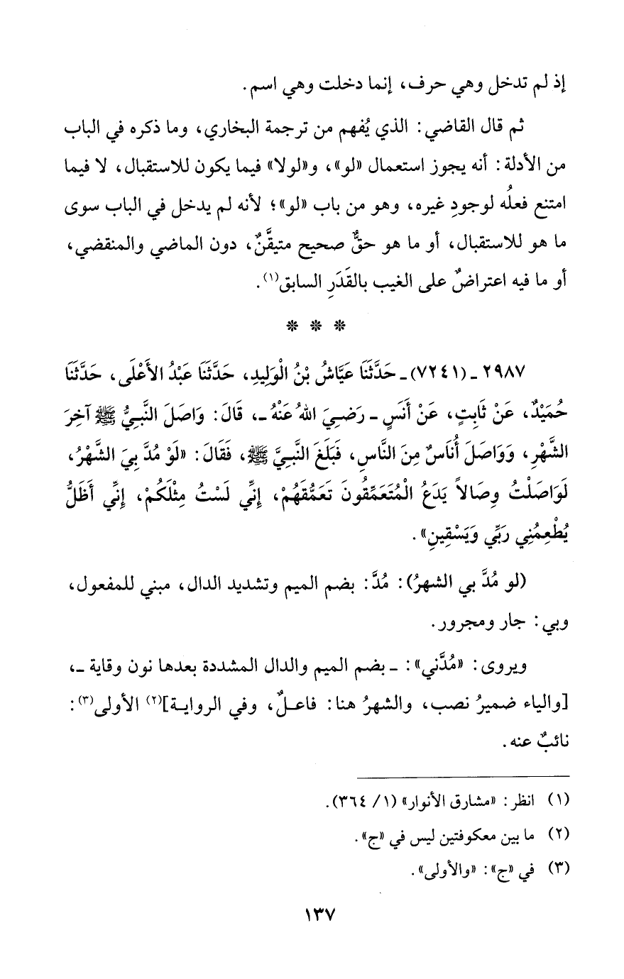 ثم قال القاضي: الذي يُفهم من ترجمة البخاري، وما ذكره في الباب من الأدلة: أنه يجوز استعمال "لو"، و"لولا" فيما يكون للاستقبال، لا فيما امتنع فعلُه لوجودِ غيره، وهو من باب "لو"؛ لأنه لم يدخل في الباب سوى ما هو للاستقبال، أو ما هو حقٌّ صحيح متيقَّنٌ، دون الماضي والمنقضي، أو ما فيه اعتراضٌ على الغيب بالقَدَرِ السابق (¬1).