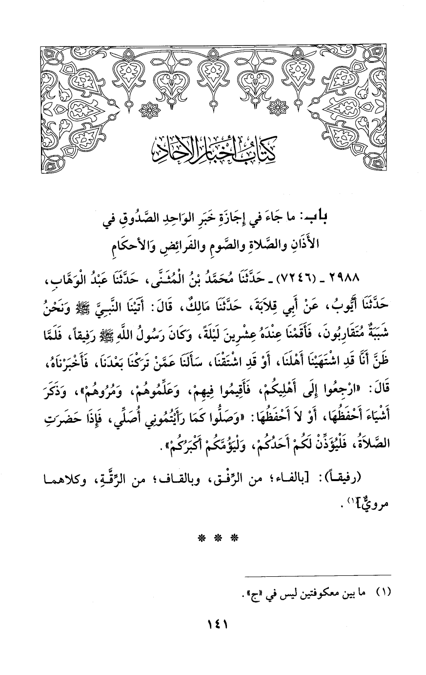 2988 - (7246) - حَدَّثَنَا مُحَمَّدُ بْنُ الْمُثَنَّى، حَدَّثَنَا عَبْدُ الْوَهَّابِ، حَدَّثَنَا أيُّوبُ، عَنْ أَبِي قِلاَبَةَ، حَدَّثَنَا مَالِكٌ، قَالَ: أَتَيْنَا النَّبِيَّ - صلى الله عليه وسلم - وَنَحْنُ شَبَبَةٌ مُتَقَارِبُونَ، فَأَقَمْنَا عِنْدَهُ عِشْرِينَ لَيْلَةً، وَكَانَ رَسُولُ اللَّهِ - صلى الله عليه وسلم - رَفِيقاً، فَلَمَّا ظَنَّ أَنَّا قَدِ اشْتَهَيْنَا أَهْلَنَا، أَوْ قَدِ اشْتَقْنَا، سَأَلَنَا عَمَّنْ تَرَكْنَا بَعْدَنَا، فَأَخْبَرْنَاهُ، قَالَ: "ارْجِعُوا إِلَى أَهْلِيكُمْ، فَأَقِيمُوا فِيهِمْ، وَعَلِّمُوهُمْ، وَمُرُوهُمْ"، وَذَكَرَ أَشْيَاءَ أَحْفَظُهَا، أَوْ لاَ أَحْفَظُهَا: "وَصَلُّوا كمَا رَأَيْتُمُونِي أُصَلِّي، فَإِذَا حَضَرَتِ الصَّلاَةُ، فَلْيُؤَذِّنْ لَكُمْ أَحَدُكُمْ، وَلْيؤُمَّكُمْ أَكْبَرُكُمْ".