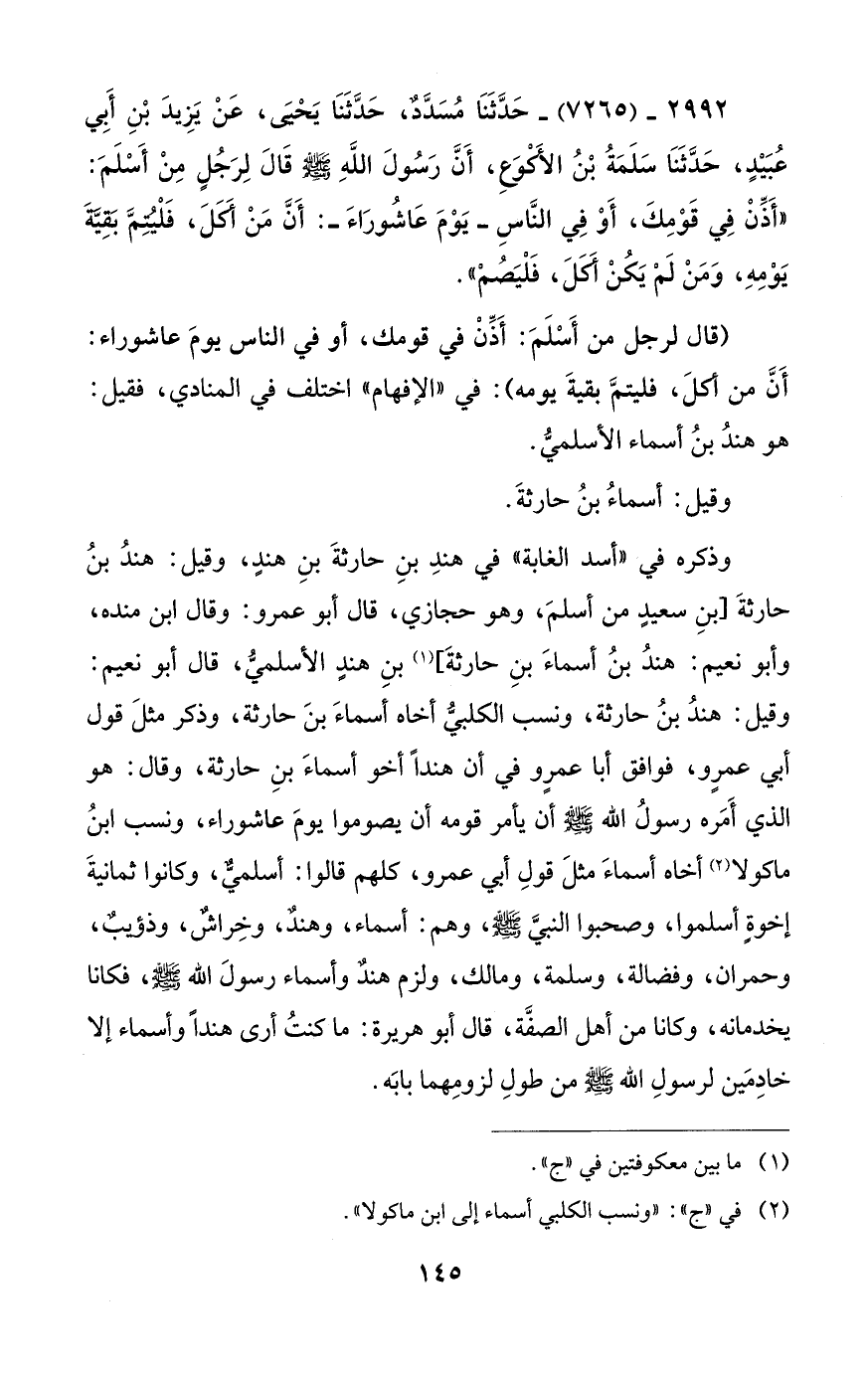 2992 - (7265) - حَدَّثَنَا مُسَدَّد، حَدَّثَنَا يَحْيَى، عَنْ يَزِيدَ بْنِ أَبِي عُبَيْدٍ، حَدَّثَنَا سَلَمَةُ بْنُ الأَكْوَعِ، أَنَّ رَسُولَ اللَّهِ - صلى الله عليه وسلم - قَالَ لِرَجُلٍ مِنْ أَسْلَمَ: "أَذِّنْ في قَوْمِكَ، أَوْ فِي النَّاسِ - يَوْمَ عَاشُورَاءَ -: أَنَّ مَنْ أَكَلَ، فَلْيُتِمَّ بَقِيَّةَ يَوْمِهِ، وَمَنْ لَمْ يَكُنْ أَكَلَ، فَلْيَصُمْ".