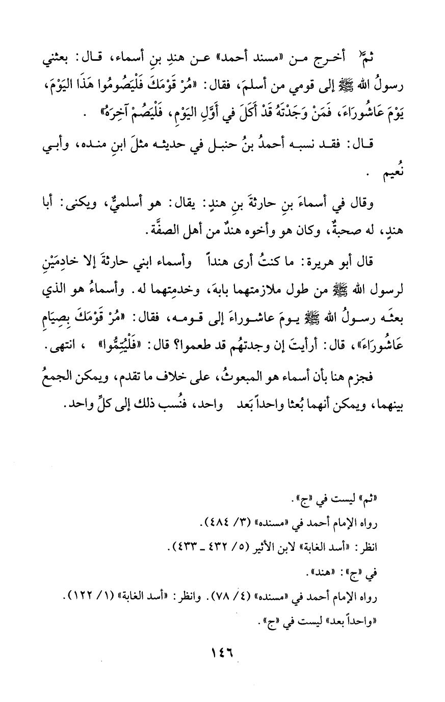 قال أبو هريرة: ما كنتُ أرى هنداً (¬4) وأسماء ابني حارثةَ إلا خادِمَيْنِ لرسول الله - صلى الله عليه وسلم - من طول ملازمتهما بابهَ، وخدمِتهما له. وأسماءُ هو الذي بعثَه رسولُ الله - صلى الله عليه وسلم - يومَ عاشوراءَ إلى قومه، فقال: "مُرْ قَوْمَكَ بِصِيَامِ عَاشُورَاءَ"، قال: أرأيتَ إن وجدتهُم قد طعموا؟ قال: "فَلْيُتِمُّوا" (¬5)، انتهى.