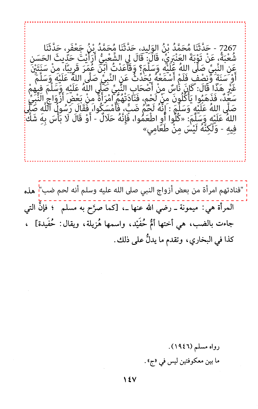 (فَنَادَتْهُمُ امْرَأَةٌ مِنْ بَعْضِ أَزْوَاجِ النَّبِيِّ صَلَّى اللهُ عَلَيْهِ وَسَلَّمَ: إِنَّهُ لَحْمُ ضَبٍّ)]] (*) هذه المرأة هي: ميمونة - رضي الله عنها -، [كما صرَّح به مسلم (¬1)؛ فإنَّ التي جاءت بالضب، هي أختها أمُّ حُفَيْد، واسمها هُزيلة، ويقال: حُفَيدة] (¬2)، كذا في البخاري، وتقدم ما يدلُّ على ذلك.