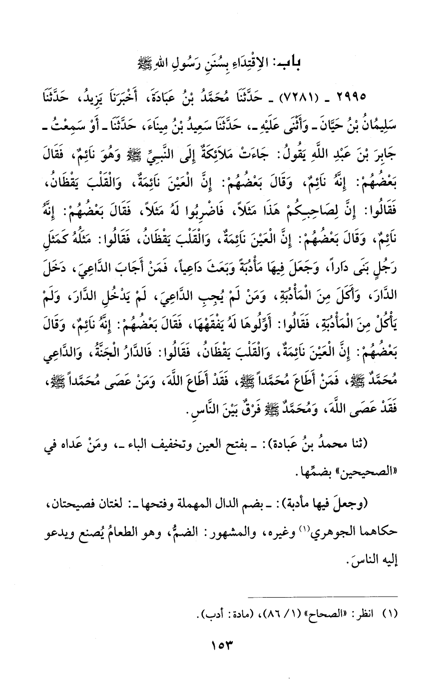 2995 - (7281) - حَدَّثَنَا مُحَمَّدُ بْنُ عَبَادَةَ، أَخْبَرَنَا يَزِيدُ، حَدَّثَنَا سَلِيمُانُ بْنُ حَيَّانَ - وَأَثْنَى عَلَيْهِ -، حَدَّثَنَا سَعِيدُ بْنُ مِينَاءَ، حَدَّثَنَا - أَوْ سَمِعْتُ - جَابِرَ بْنَ عَبْدِ اللَّهِ يَقُولُ: جَاءَتْ مَلاَئِكَةٌ إِلَى النَّبِيِّ - صلى الله عليه وسلم - وَهُوَ ناَئِمٌ، فَقَالَ بَعْضُهُمْ: إِنَّهُ نَائِمٌ، وَقَالَ بَعْضُهُمْ: إِنَّ الْعَيْنَ ناَئِمَةٌ، وَالْقَلْبَ يَقْظَانُ، فَقَالُوا: إِنَّ لِصَاحِبِكُمْ هَذَا مَثَلًا، فَاضْرِبُوا لَهُ مَثَلًا، فَقَالَ بَعْضُهُمْ: إِنَّهُ ناَئِمٌ، وَقَالَ بَعْضُهُمْ: إِنَّ الْعَيْنَ ناَئِمَةٌ، وَالْقَلْبَ يَقْظَانُ، فَقَالُوا: مَثَلُهُ كَمَثَلِ رَجُلٍ بَنَى دَاراً، وَجَعَلَ فِيهَا مَأْدُبَةً وَبَعَثَ دَاعِياً، فَمَنْ أَجَابَ الدَّاعِيَ، دَخَلَ الدَّارَ، وَأكَلَ مِنَ الْمَأْدُبَةِ، وَمَنْ لَمْ يُجِبِ الدَّاعِيَ، لَمْ يَدْخُلِ الدَّارَ، وَلَمْ يَأْكُلْ مِنَ الْمَأْدُبَةِ، فَقَالُوا: أَوِّلُوهَا لَهُ يَفْقَهْهَا، فَقَالَ بَعْضُهُمْ: إِنَّهُ نَائِمٌ، وَقَالَ بَعْضُهُمْ: إِنَّ الْعَيْنَ ناَئِمَةٌ، وَالْقَلْبَ يَقْظَانُ، فَقَالُوا: فَالدَّارُ الْجَنَّةُ، وَالدَّاعِي مُحَمَّدٌ - صلى الله عليه وسلم -، فَمَنْ أَطَاعَ مُحَمَّداً - صلى الله عليه وسلم -، فَقَدْ أَطَاعَ اللَّهَ، وَمَنْ عَصَى مُحَمَّداً - صلى الله عليه وسلم -، فَقَدْ عَصَى اللَّهَ، وَمُحَمَّدٌ - صلى الله عليه وسلم - فَرْقٌ بَيْنَ النَّاسِ.