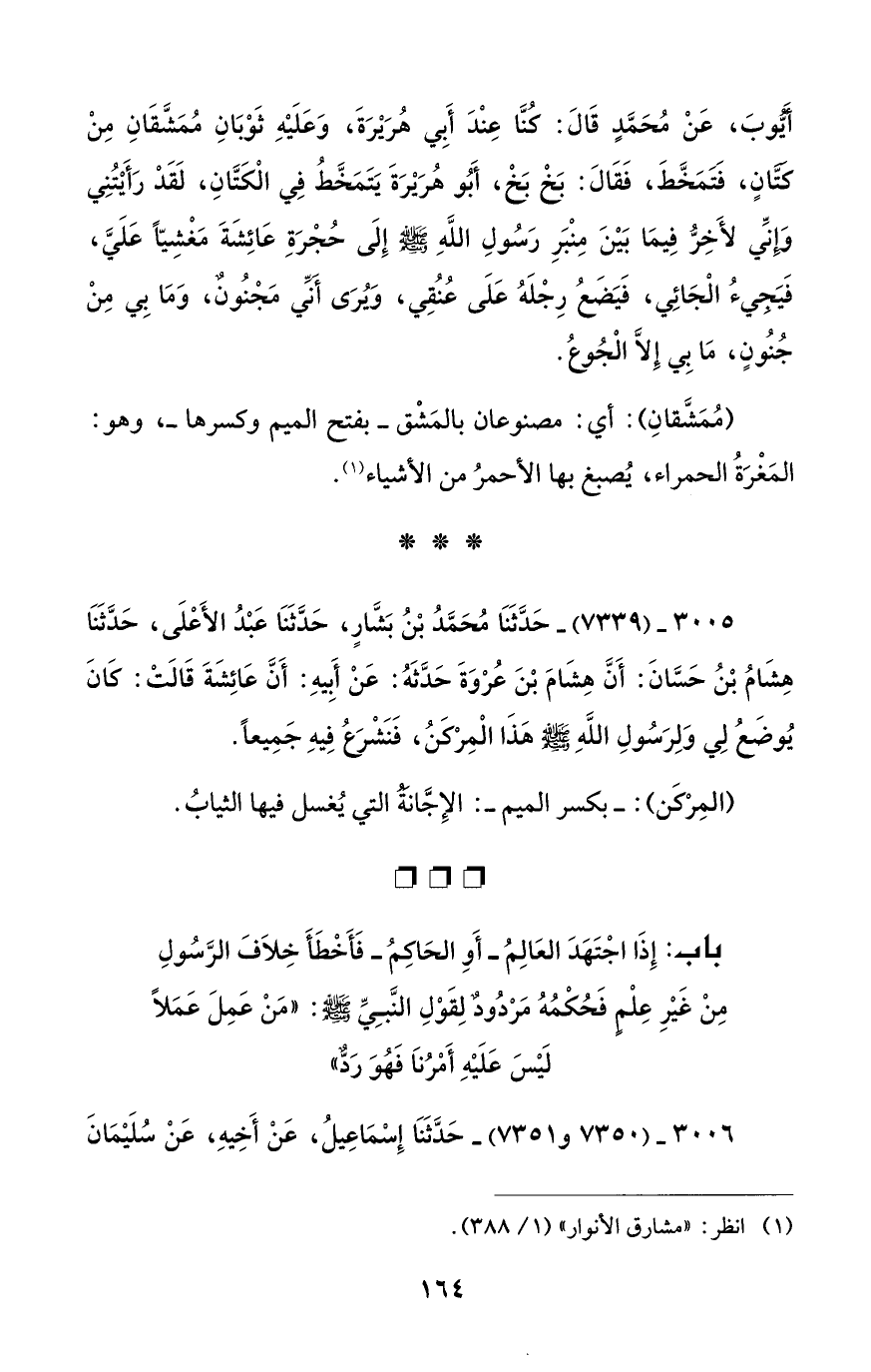 3005 - (7339) - حَدَّثَنَا مُحَمَّدُ بْنُ بَشَّارٍ، حدثنا عَبْدُ الأَعْلَى، حَدَّثَنَا هِشَامُ بْنُ حَسَّانَ: أَنَّ هِشَامَ بْنَ عُرْوَةَ حَدَّثَهُ: عَنْ أَبِيهِ: أَنَّ عَائِشَةَ قَالَتْ: كَانَ يُوضَعُ لِي وَلِرَسُولِ اللَّهِ - صلى الله عليه وسلم - هَذَا الْمِرْكَنُ، فَنَشْرَعُ فِيهِ جَمِيعاً.