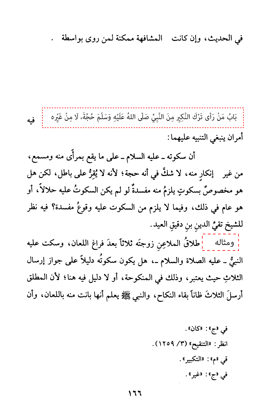 [[الأول]] أن سكوته - عليه السلام - على ما يقع بمرأًى منه ومسمع، من غير (¬4) إنكارٍ منه، لا شكَّ في أنه حجة؛ لأنه لا يُقِرُّ على باطل، لكن هل هو مخصوصٌ بسكوتٍ يلزمُ منه مفسدةٌ لو لم يكن السكوتُ عليه حلالًا، أو هو عام في ذلك، وفيما لا يلزم من السكوت عليه وقوعُ مفسدة؟ فيه نظر للشيخ تقيِّ الدينِ بنِ دقيقِ العيد.