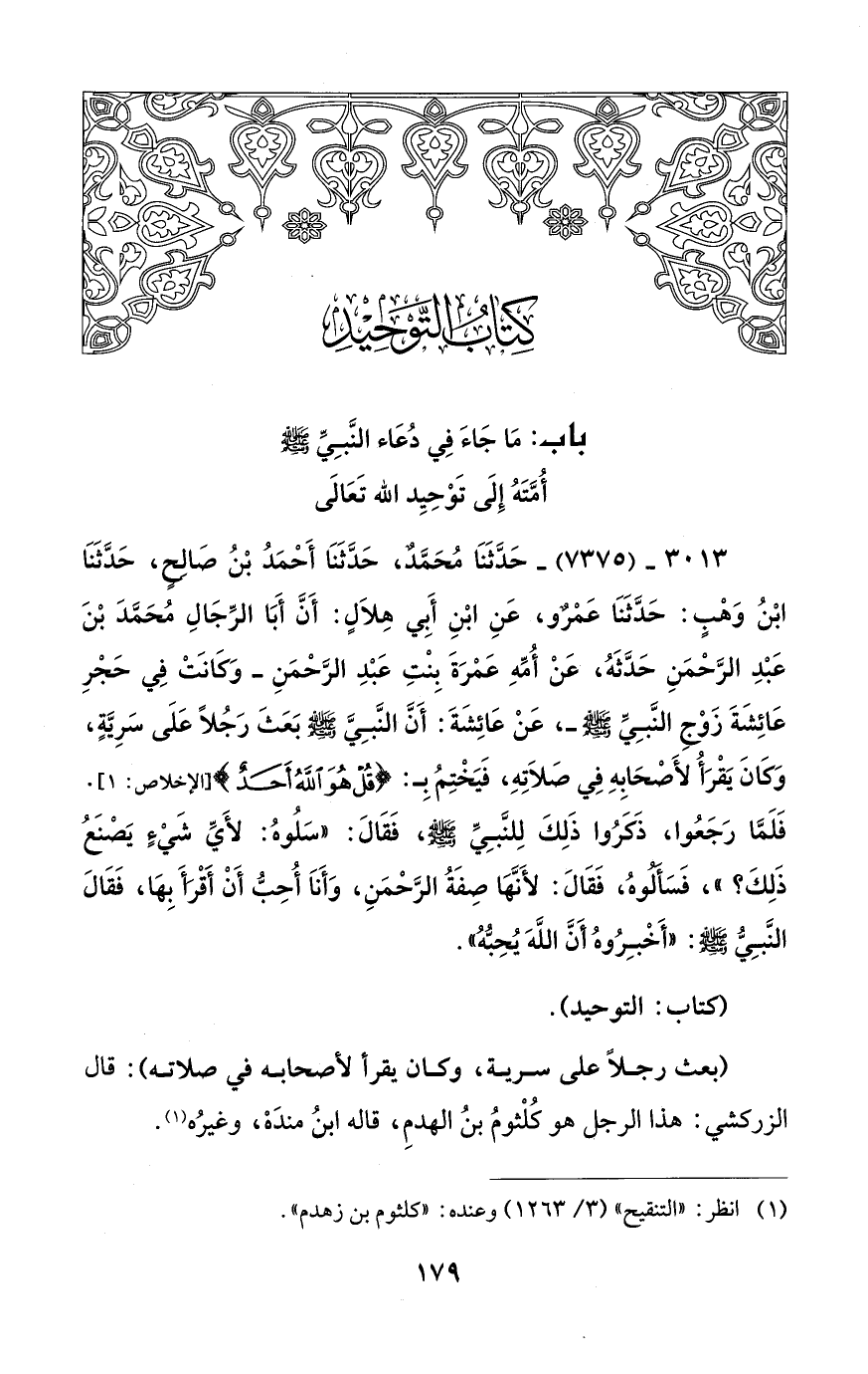 3013 - (7375) - حَدَّثَنَا مُحَمَّد، حَدَّثَنَا أَحْمَدُ بْنُ صَالِحٍ، حَدَّثَنَا ابْنُ وَهْبٍ: حَدَّثَنَا عَمْرٌو، عَنِ ابْنِ أِبي هِلاَلٍ: أَنَّ أبَا الرِّجَالِ مُحَمَّدَ بْنَ عَبْدِ الرَّحْمَنِ حَدَّثَهُ، عَنْ أُمِّهِ عَمْرَةَ بِنْتِ عَبْدِ الرَّحْمَنِ - وَكَانَتْ في حَجْرِ عَائِشَةَ زَوْجِ النَّبِيِّ - صلى الله عليه وسلم -، عَنْ عَائِشَةَ: أَنَّ النَّبِيَّ - صلى الله عليه وسلم - بَعَثَ رَجُلًا عَلَى سَرِيَّةٍ، وَكَانَ يَقْرَأُ لأَصْحَابِهِ في صَلاَتِهِ، فَيَخْتِمُ بِـ: {قُلْ هُوَ اللَّهُ أَحَدٌ} [الإخلاص: 1]. فَلَمَّا رَجَعُوا، ذَكَرُوا ذَلِكَ لِلنَّبِيِّ - صلى الله عليه وسلم -، فَقَالَ: "سَلُوهُ: لأَيِّ شَيْءٍ يَصْنَعُ ذَلِكَ؟ "، فَسَأَلُوهُ، فَقَالَ: لأَنَّهَا صِفَةُ الرَّحْمَنِ، وَأَناَ أُحِبُّ أَنْ أَقْرَأَ بِهَا، فَقَالَ النَّبِيُّ - صلى الله عليه وسلم -: "أَخْبِرُوهُ أَنَّ اللَّهَ يُحِبُّهُ".