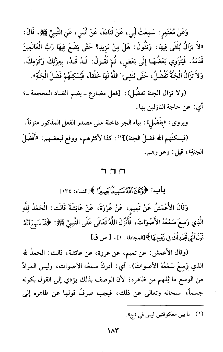 وَعَنْ مُعْتَمِرٍ: سَمِعْتُ أَبي، عَنْ قتادَةَ، عَنْ أَنَسٍ، عَنِ النَّبِيِّ - صلى الله عليه وسلم -، قَالَ: "لاَ يَزَالُ يُلْقَى فِيهَا، وَتَقُولُ: هَلْ مِنْ مَزِيدٍ؟ حَتَّى يَضَعَ فِيهَا رَبُّ الْعَالَمِينَ قَدَمَهُ، فَينزَوِي بَعْضُهَا إِلَى بَعْضٍ، ثُمَّ تَقُولُ: قَدْ قَدْ، بِعِزَّتِكَ وَكَرَمِكَ. وَلاَ تَزَالُ الْجَنَّةُ تَفْضُلُ، حَتَى يُنْشِيءَ اللَّهُ لَهَا خَلْقاً، فَيُسْكِنَهُمْ فَضْلَ الْجَنَّةِ".