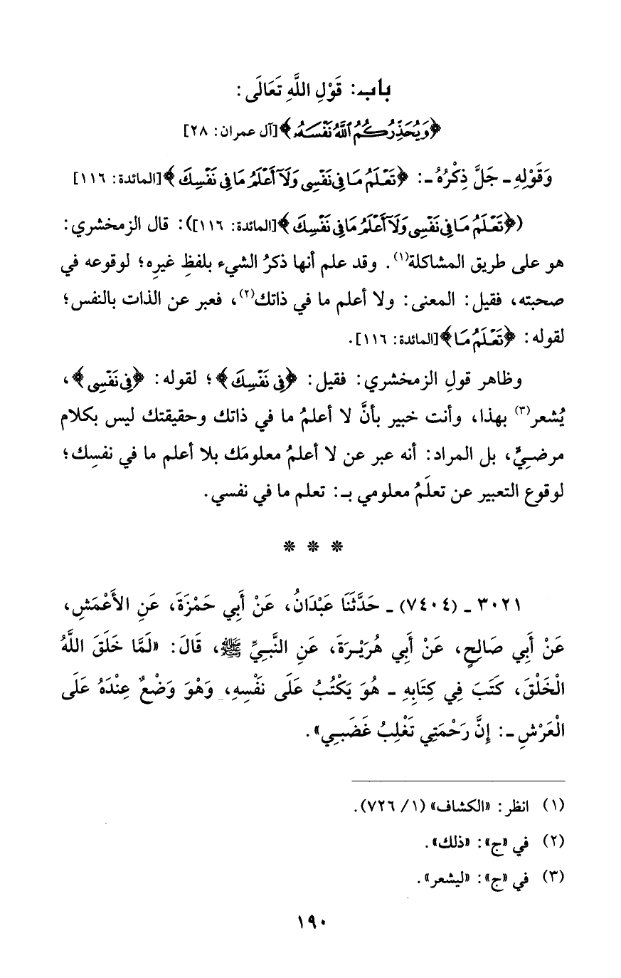 وَقوله -جَلَّ ذِكْرُهُ -: {تَعْلَمُ مَا فِي نَفْسِي وَلَا أَعْلَمُ مَا فِي نَفْسِكَ} [المائدة: 116]