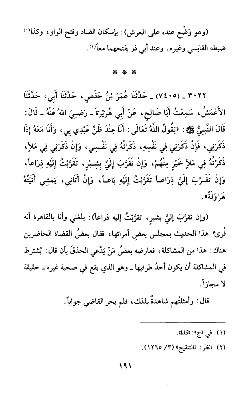 (وإن تقرَّبَ إليَّ بشبرٍ، تقرَّبْتُ إليه ذراعاً): بلغني وأنا بالقاهرة أنه قُريء هذا الحديث بمجلس بعضِ أمرائها، فقال بعضُ القضاة الحاضرين هناك: هذا من المشاكلة، فعارضه بعضُ مَنْ يَدَّعي الحذقَ بأن قال: يُشترط في المشاكلة أن يكون أحدُ طرفيها - وهو الذي يقع في صحبة غيره - حقيقة لا مجازاً.