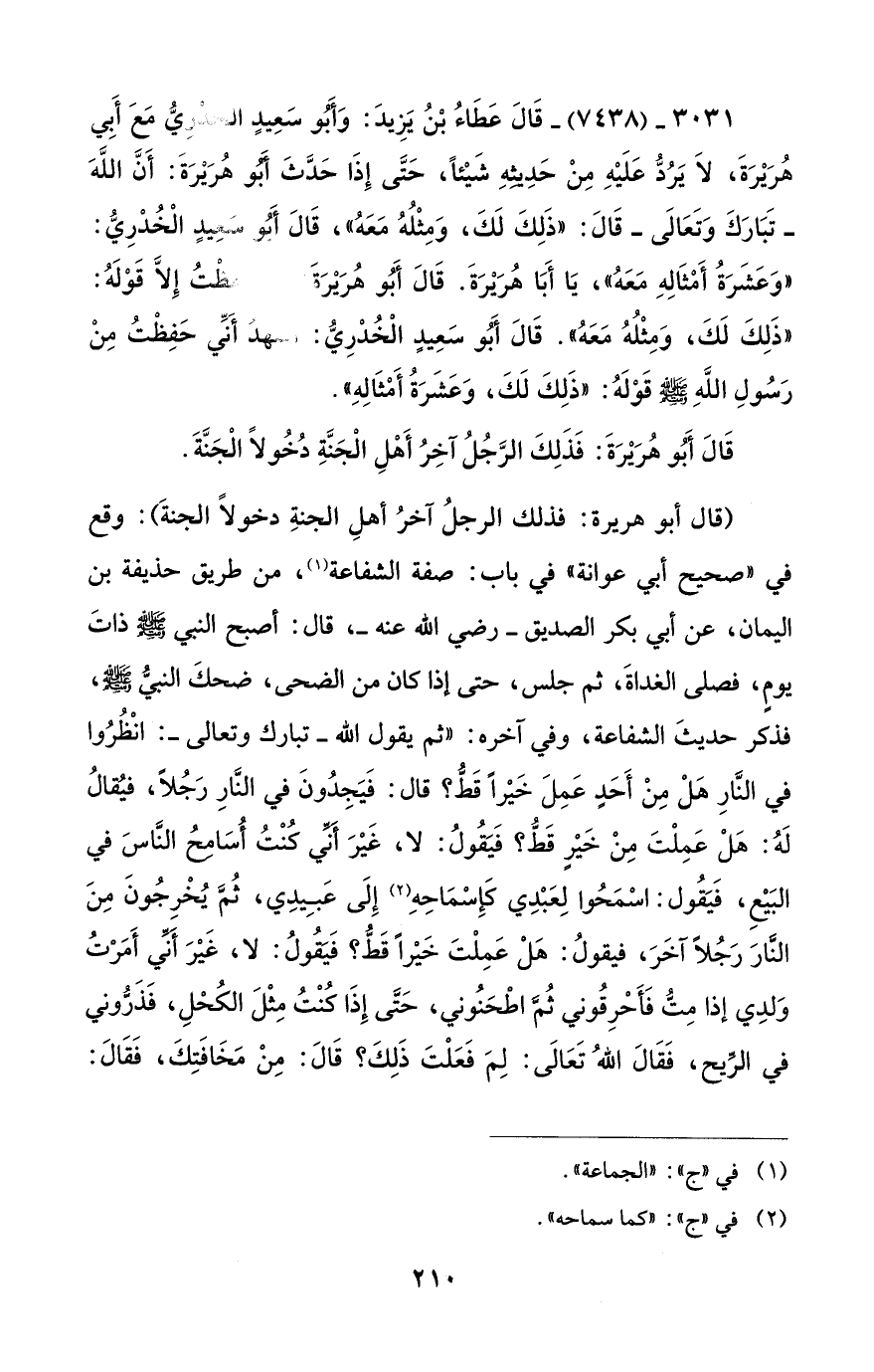 3031 - (7438) - قَالَ عَطَاءُ بْنُ يَزِيدَ: وَأَبُو سَعِيدٍ الخُدْرِيُّ مَعَ أبِي هُرَيْرَةَ، لاَ يَرُدُّ عَلَيْهِ مِنْ حَدِيثِهِ شَيْئاً، حَتَّى إِذَا حَدَّثَ أبُو هُرَيرَةَ: أَنَّ اللَّهَ - تَبَارَكَ وَتَعَالَى - قَالَ: "ذَلِكَ لَكَ، وَمِثْلُهُ مَعَهُ"، قَالَ أَبُو سَعِيدٍ الْخُدْرِيُّ: "وَعَشَرَةُ أَمْثَالِهِ مَعَهُ"، يَا أَبَا هُرَيْرَةَ. قَالَ أَبُو هُرَيْرَة حَفظْتُ إِلَّا قَوْلَهُ: "ذَلِكَ لَكَ، وَمِثْلُهُ مَعَهُ". قَالَ أَبُو سَعِيدٍ الْخُدْرِيُّ: شهدَ أنِّي حَفِظْتُ مِنْ رَسُولِ اللَّهِ - صلى الله عليه وسلم - قَوْلَهُ: "ذَلِكَ لَكَ، وَعَشَرَةُ أَمْثَالِهِ".