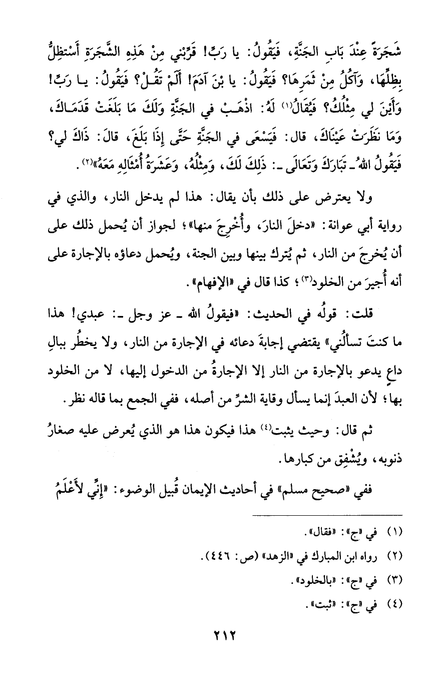 قلت: قولُه في الحديث: "فيقولُ الله - عز وجل -: عبدي! هذا ما كنتَ تسألُني" يقتضي إجابةَ دعائه في الإجارة من النار، ولا يخطُر ببالِ داعٍ يدعو بالإجارة من النار إلا الإجارةُ من الدخول إليها، لا من الخلود بها؛ لأن العبدَ إنما يسأل وقاية الشرِّ من أصله، ففي الجمع بما قاله نظر.