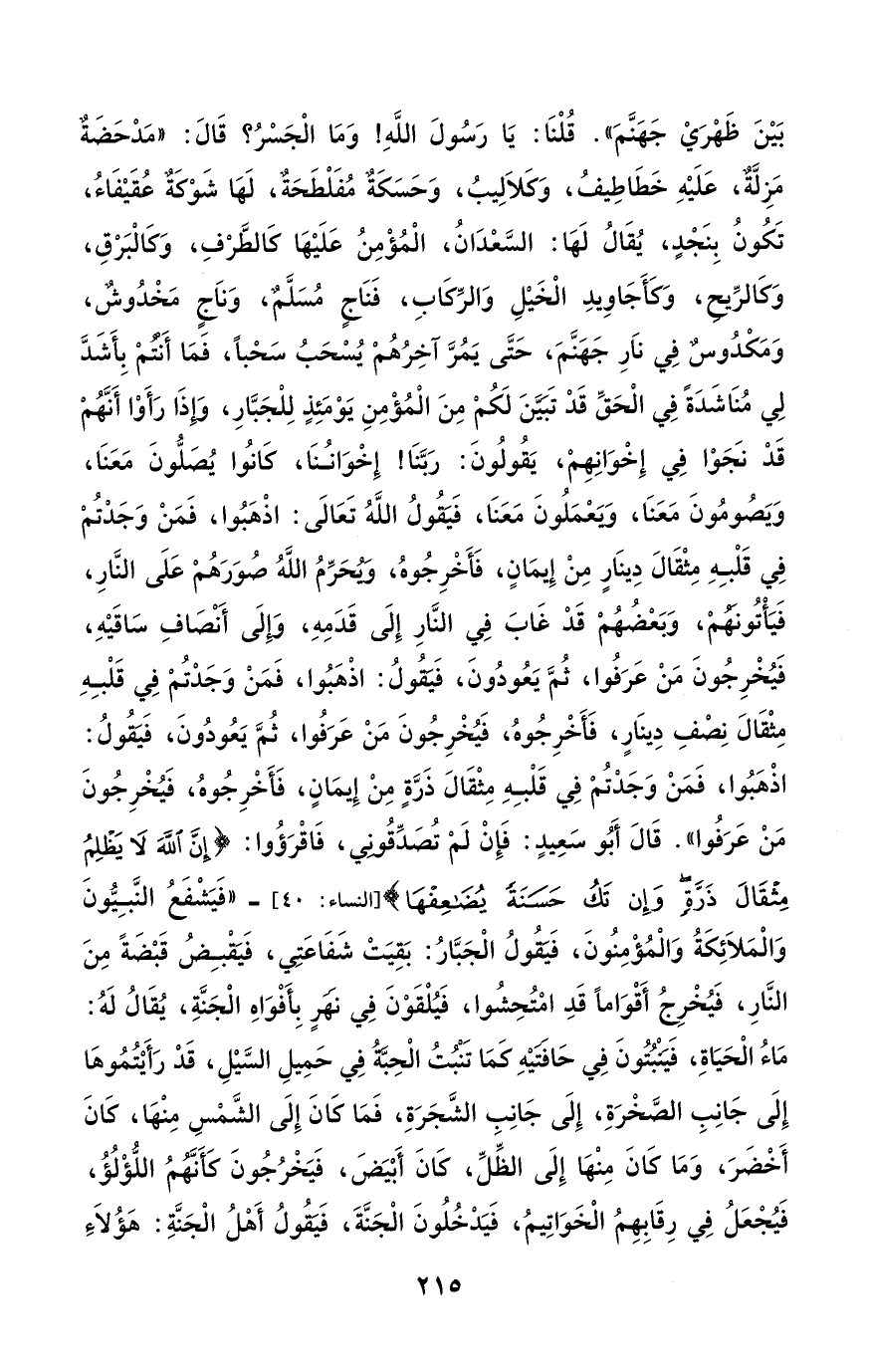 بَيْنَ ظَهْرَيْ جَهَنَّمَ". قُلْنَا: يَا رَسُولَ اللَّهِ! وَمَا الْجَسْرُ؟ قَالَ: "مَدْحَضَةٌ مَزِلَّةٌ، عَلَيْهِ خَطَاطِيفُ، وَكَلاَلِيبُ، وَحَسَكَةٌ مُفَلْطَحَةٌ، لَهَا شَوْكَةٌ عُقَيْفَاءُ، تَكُونُ بِنَجْدٍ، يُقَالُ لَهَا: السَّعْدَانُ، الْمُؤْمِنُ عَلَيْهَا كالطَّوْفِ، وَكَالْبَرْقِ، وَكَالرِّيحِ، وَكأَجَاوِيدِ الْخَيْلِ وَالرِّكَابِ، فَنَاجٍ مُسَلَّمٌ، وَنَاجٍ مَخْدُوشٌ، وَمَكْدُوسٌ فِي نَارِ جَهَنَّمَ، حَتَّى يَمُرَّ آخِرُهُمْ يُسْحَبُ سَحْباً، فَمَا أَنْتُمْ بِأَشَدَّ لِي مُنَاشَدَةً فِي الْحَقِّ قَدْ تَبيَّنَ لَكُمْ مِنَ الْمُؤْمِنِ يَوْمَئِذٍ لِلْجَبَّارِ، وَإِذَا رَأَوْا أَنَّهُمْ قَدْ نَجَوْا في إِخْوَانِهِمْ، يَقُولُونَ: رَبَّنَا! إِخْوَانُنَا، كَانوُا يُصَلُّونَ مَعَنَا، وَيَصُومُونَ مَعَنَا، وَيَعْمَلُونَ مَعَنَا، فَيَقُولُ اللَّهُ تَعَالَى: اذْهَبُوا، فَمَنْ وَجَدْتُمْ فِي قَلْبِهِ مِثْقَالَ دِينَارٍ مِنْ إِيمَانٍ، فَأَخْرِجُوهُ، ويُحَرِّمُ اللَّهُ صُوَرَهُمْ عَلَى النَّارِ، فَيَأْتُونَهُمْ، وَبَعْضُهُمْ قَدْ غَابَ في النَّارِ إِلَى قَدَمِهِ، وَإِلَى أَنْصَافِ سَاقَيْهِ، فَيُخْرِجُونَ مَنْ عَرَفُوا، ثُمَّ يَعُودُونَ، فَيقُولُ: اذْهَبُوا، فَمَنْ وَجَدْتُمْ فِي قَلْبِهِ مِثْقَالَ نِصْفِ دِينَارٍ، فَأَخْرِجُوهُ، فَيُخْرِجُونَ مَنْ عَرَفُوا، ثُمَّ يَعُودُونَ، فَيَقُولُ: اذْهَبُوا، فَمَنْ وَجَدْتُمْ فِي قَلْبِهِ مِثْقَالَ ذَرَّةٍ مِنْ إِيمَانٍ، فَأخْرِجُوهُ، فَيُخْرِجُونَ مَنْ عَرَفُوا". قَالَ أَبُو سَعِيدٍ: فَإِنْ لَمْ تُصَدِّقُونِي، فَاقْرَؤُوا: {إِنَّ اللَّهَ لَا يَظْلِمُ مِثْقَالَ ذَرَّةٍ وَإِنْ تَكُ حَسَنَةً يُضَاعِفْهَا} [النساء: 40]- "فَيَشْفَعُ النَّبِيُّون وَالْمَلاَئِكَةُ وَالْمُؤْمِنُونَ، فَيقُولُ الْجَبَّارُ: بَقِيَتْ شَفَاعَتِي، فَيَقْبِضُ قَبْضَةً مِنَ النَّارِ، فَيُخْرِجُ أَقْوَاماً قَدِ امْتُحِشُوا، فَيُلْقَوْنَ فِي نَهَرٍ بِأَفْوَاهِ الْجَنَّةِ، يُقَالُ لَهُ: مَاءُ الْحَيَاةِ، فَيَنْبُتُونَ فِي حَافَتَيْهِ كمَا تَنْبُتُ الْحِبَّةُ في حَمِيلِ السَّيْلِ، قَدْ رَأَيْتُمُوهَا إِلَى جَانِبِ الصَّخْرَةِ، إِلَى جَانِب الشَّجَرَةِ، فَمَا كَانَ إِلَى الشَّمْسِ مِنْهَا، كَانَ أَخْضَرَ، وَمَا كَانَ مِنْهَا إِلَى الظِّلِّ، كَانَ أَبْيَضَ، فَيَخْرُجُونَ كَأَنَّهُمُ اللُّؤْلُؤُ، فَيُجْعَلُ في رِقَابِهِمُ الْخَوَاتِيمُ، فَيَدْخُلُونَ الْجَنَّةَ، فَيقُولُ أَهْلُ الْجَنَّةِ: هَؤُلاَءِ