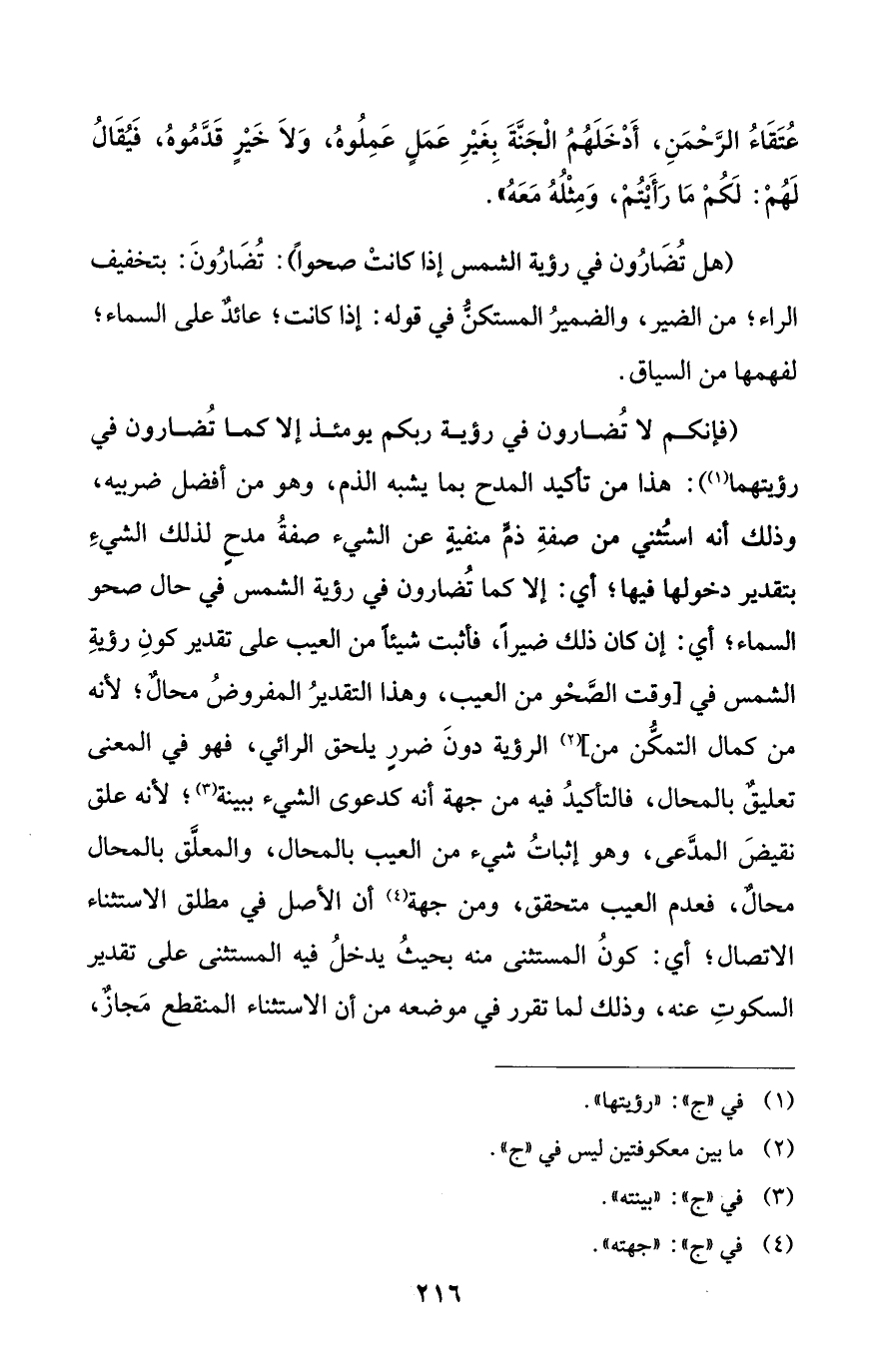 (فإنكم لا تُضارون في رؤية ربكم يومئذ إلا كما تُضارون في رؤيتهما (¬1)): هذا من تأكيد المدح بما يشبه الذم، وهو من أفضل ضربيه، وذلك أنه استُثني من صفةِ ذمٍّ منفيةٍ عن الشيء صفةُ مدحٍ لذلك الشيءِ بتقدير دخولها فيها؛ أي: إلا كما تُضارون في رؤية الشمس في حال صحو السماء؛ أي: إن كان ذلك ضيراً، فأثبت شيئاً من العيب على تقدير كونِ رؤيةِ الشمس في [وقت الصَّحْو من العيب، وهذا التقديرُ المفروضُ محالٌ؛ لأنه من كمال التمكُّن من] (¬2) الرؤية دونَ ضررٍ يلحق الرائي، فهو في المعنى تعليقٌ بالمحال، فالتأكيدُ فيه من جهة أنه كدعوى الشيء ببينة (¬3)؛ لأنه علق نقيضَ المدَّعى، وهو إثباتُ شيء من العيب بالمحال، والمعلَّق بالمحال محالٌ، فعدم العيب متحقق، ومن جهة (¬4) أن الأصل في مطلق الاستثناء الاتصال؛ أي: كونُ المستثنى منه بحيثُ يدخلُ فيه المستثنى على تقدير السكوتِ عنه، وذلك لما تقرر في موضعه من أن الاستثناء المنقطع مَجازٌ،