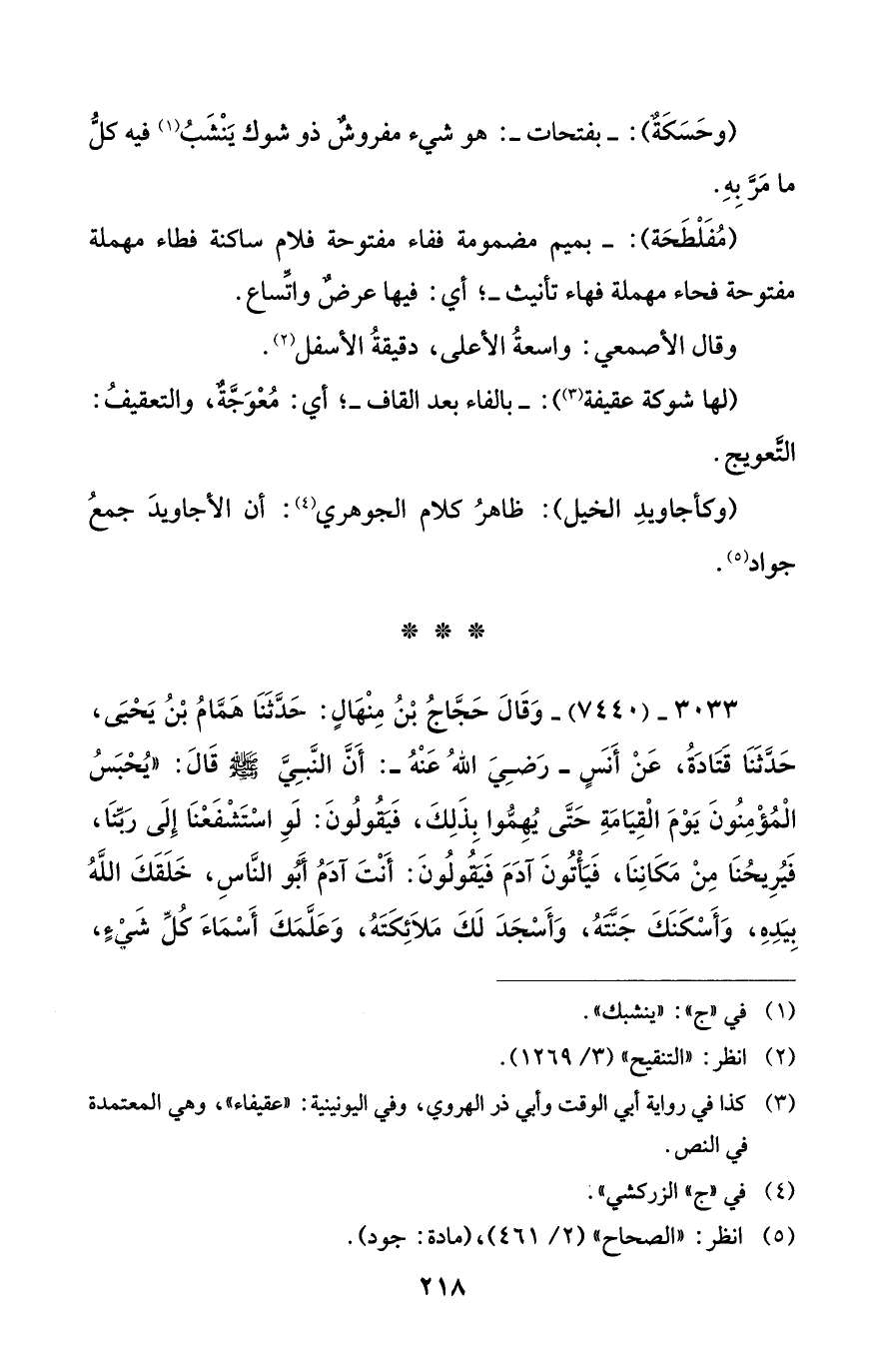 3033 - (7440) - وَقَالَ حَجَّاجُ بْنُ مِنْهَالٍ: حَدَّثَنَا هَمَّامُ بْنُ يَحْيَى، حَدَّثَنَا قَتَادَةُ، عَنْ أَنَسٍ - رَضِيَ اللهُ عَنْهُ -: أَنَّ النَّبِيَّ - صلى الله عليه وسلم - قَالَ: "يُحْبَسُ الْمُؤْمِنُونَ يَوْمَ الْقِيَامَةِ حَتَّى يُهِمُّوا بِذَلِكَ، فَيَقُولُونَ: لَوِ اسْتَشْفَعْنَا إِلَى رَبِّنَا، فَيُرِيحُنَا مِنْ مَكَانِنَا، فَيَأْتُونَ آدَمَ فَيَقُولُونَ: أَنْتَ آدَمُ أَبُو النَّاسِ، خَلَقَكَ اللَّهُ بِيَدِهِ، وَأَسْكَنَكَ جَنَّتَهُ، وَأَسْجَدَ لَكَ مَلاَئِكَتَهُ، وَعَلَّمَكَ أَسْمَاءَ كُلِّ شَيْءٍ،