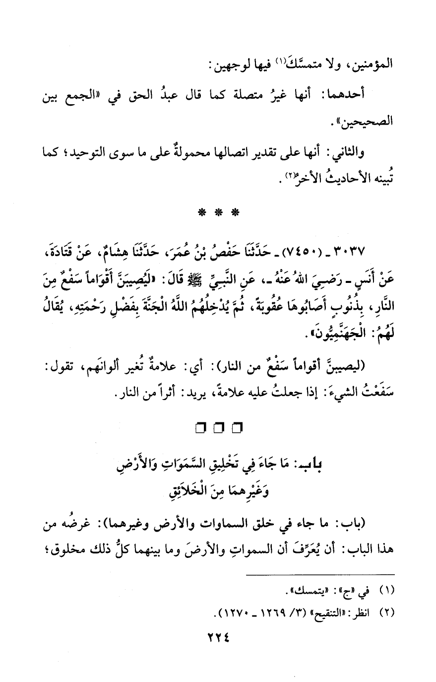 3037 - (7450) - حَدَّثَنَا حَفْصُ بْنُ عُمَرَ، حَدَّثَنَا هِشَامٌ، عَنْ قَتَادَةَ، عَنْ أَنَسٍ - رَضِيَ اللهُ عَنْهُ -، عَنِ النَّبِيِّ - صلى الله عليه وسلم - قَالَ: "لَيُصِيبَنَّ أَقْوَاماً سَفْعٌ مِنَ النَّارِ، بِذُنُوبٍ أَصَابُوهَا عُقُوبَةً، ثُمَّ يُدْخِلُهُمُ اللَّهُ الْجَنَّةَ بِفَضْلِ رَحْمَتِهِ، يُقَالُ لَهُمُ: الْجَهَنَّمِيُّونَ".
