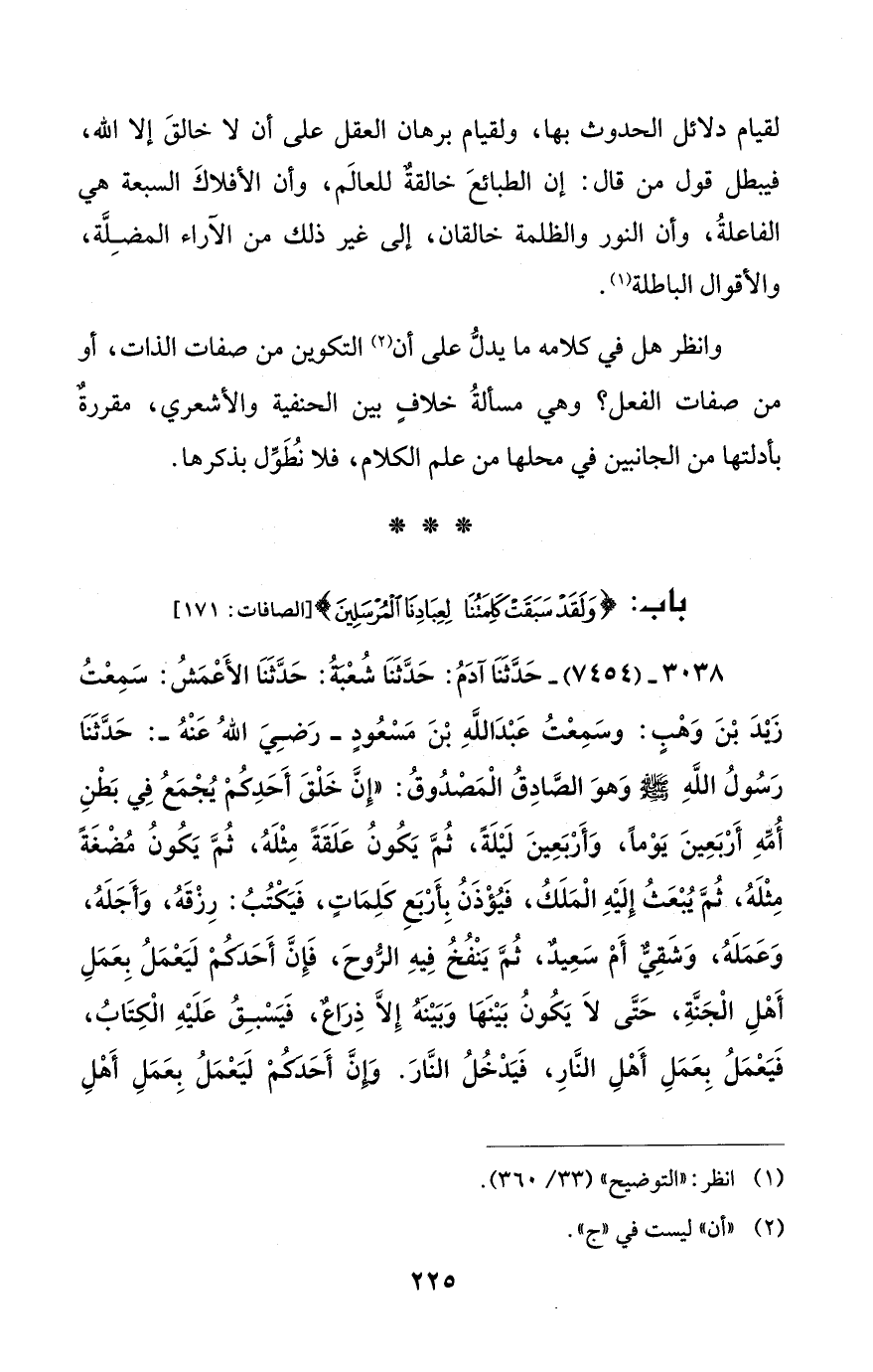 وانظر هل في كلامه ما يدلُّ على أن (¬2) التكوين من صفات الذات، أو من صفات الفعل؟ وهي مسألةُ خلافٍ بين الحنفية والأشعري، مقررةٌ بأدلتها من الجانبين في محلها من علم الكلام، فلا نُطَوِّل بذكرها.