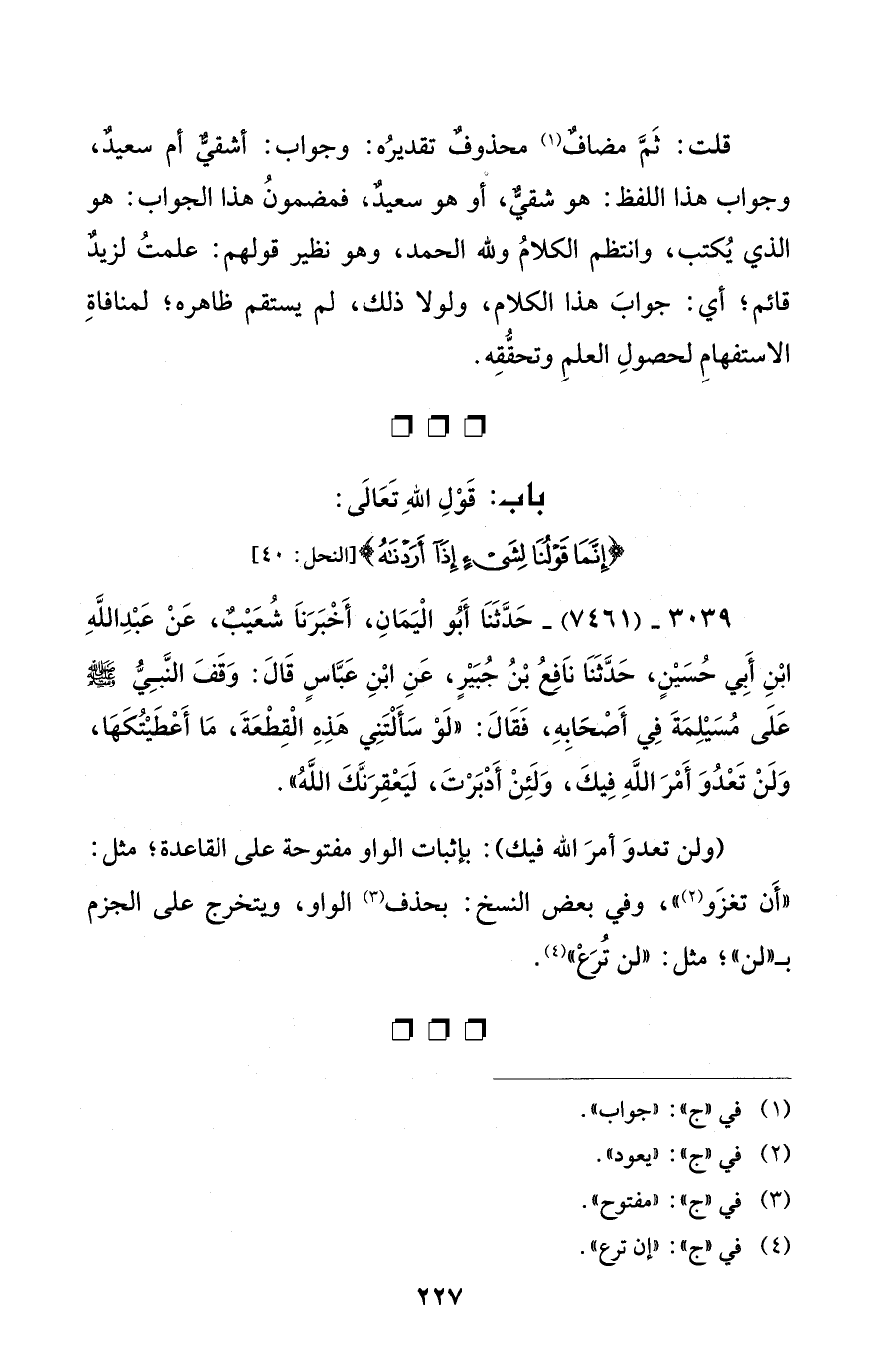 3039 - (7461) - حَدَّثَنَا أَبُو الْيَمَانِ، أَخْبَرَنَا شُعَيْبٌ، عَنْ عَبْدِ اللَّهِ ابْنِ أَبِي حُسَيْنٍ، حَدَّثَنَا ناَفِعُ بْنُ جُبَيْرٍ، عَنِ ابْنِ عَبَّاسٍ قَالَ: وَقَفَ النَّبِيُّ - صلى الله عليه وسلم - عَلَى مُسَيْلِمَةَ في أَصْحَابِهِ، فَقَالَ: "لَوْ سَأَلْتَنِي هَذ الْقِطْعَةَ، مَا أَعْطَيْتُكَهَا، وَلَنْ تَعْدُوَ أَمْرَ اللَّهِ فِيكَ، وَلَئِنْ أَدْبَرْتَ، لَيَعْقِرَنَّكَ اللَّهُ".