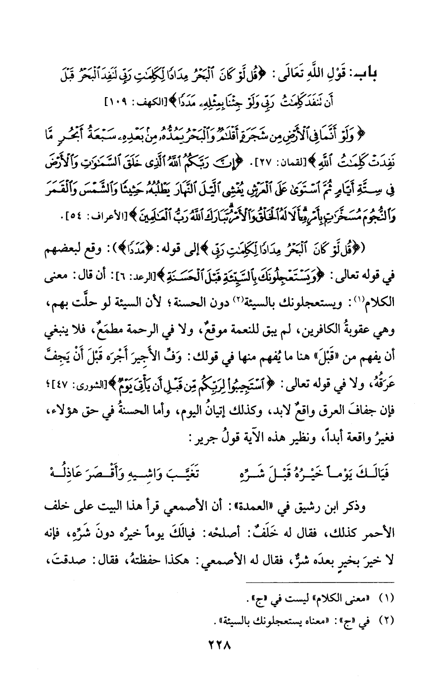 ({قُلْ لَوْ كَانَ الْبَحْرُ مِدَادًا لِكَلِمَاتِ رَبِّي} إلى قوله: {مَدَدًا}): وقع لبعضهم في قوله تعالى: {وَيَسْتَعْجِلُونَكَ بِالسَّيِّئَةِ قَبْلَ الْحَسَنَةِ} [الرعد: 6]: أن قال: معنى الكلام (¬1): ويستعجلونك بالسيئة (¬2) دون الحسنة؛ لأن السيئة لو حلَّت بهم، وهي عقوبةُ الكافرين، لم يبق للنعمة موقعٌ، ولا في الرحمة مطمَعٌ، فلا ينبغي أن يفهم من "قَبْلَ" هنا ما يُفهم منها في قولك: وَفِّ الأَجِيرَ أَجْرَه قَبْلَ أَنْ يَجِفَّ عَرَقُهُ، ولا في قوله تعالى: {اسْتَجِيبُوا لِرَبِّكُمْ مِنْ قَبْلِ أَنْ يَأْتِيَ يَوْمٌ} [الشورى: 47]؛ فإن جفافَ العرق واقعٌ لا بد، وكذلك إتيانُ اليوم، وأما الحسنةُ في حق هؤلاء، فغيرُ واقعة أبداً، ونظير هذه الآية قولُ جرير: