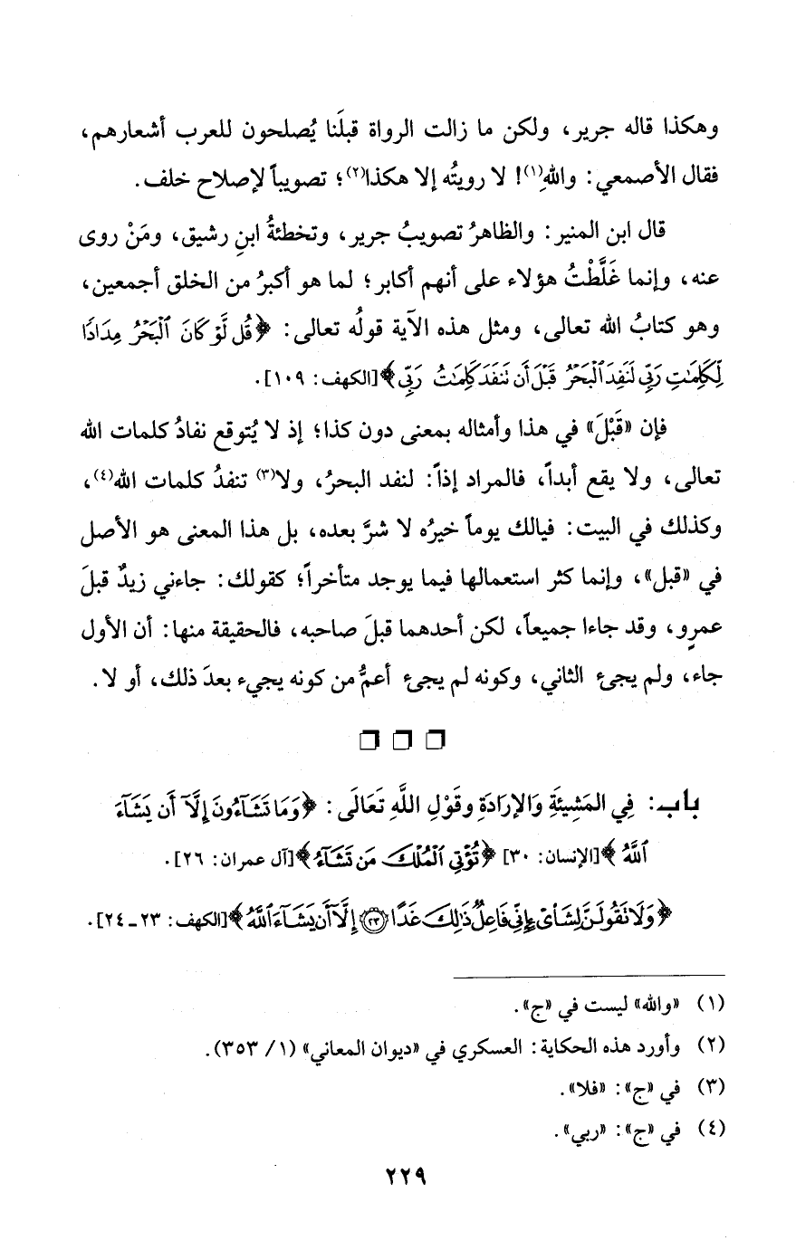 قال ابن المنير: والظاهرُ تصويبُ جرير، وتخطئةُ ابنِ رشيق، ومَنْ روى عنه، وإنما غَلَّطْتُ هؤلاء على أنهم أكابر؛ لما هو أكبرُ من الخلق أجمعين، وهو كتابُ الله تعالى، ومثل هذه الآية قولُه تعالى: {قُلْ لَوْ كَانَ الْبَحْرُ مِدَادًا لِكَلِمَاتِ رَبِّي لَنَفِدَ الْبَحْرُ قَبْلَ أَنْ تَنْفَدَ كَلِمَاتُ رَبِّي} [الكهف: 109].