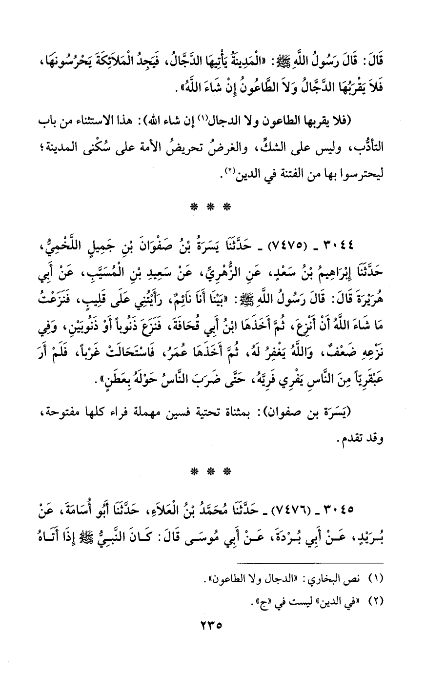 قَالَ: قَالَ رَسُولُ اللَّهِ - صلى الله عليه وسلم -: "الْمَدِينَةُ يَأْتِيهَا الدَّجَّالُ، فَيَجدُ الْمَلاَئِكَةَ يَحْرُسُونَهَا، فَلاَ يَقْرَبُهَا الدَّجَّالُ وَلاَ الطَّاعُونُ إِنْ شَاءَ اللَّهُ".