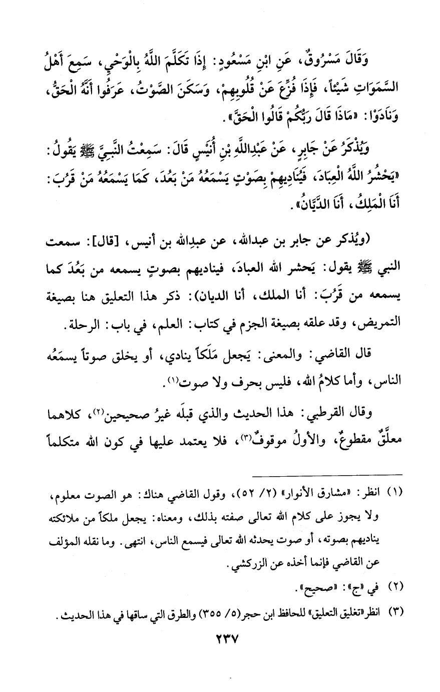 وقال القرطبي: هذا الحديث والذي قبلَه غيرُ صحيحين (¬2)، كلاهما معلَّقٌ مقطوعٌ، والأولُ موقوفٌ (¬3)، فلا يعتمد عليها في كون الله متكلماً