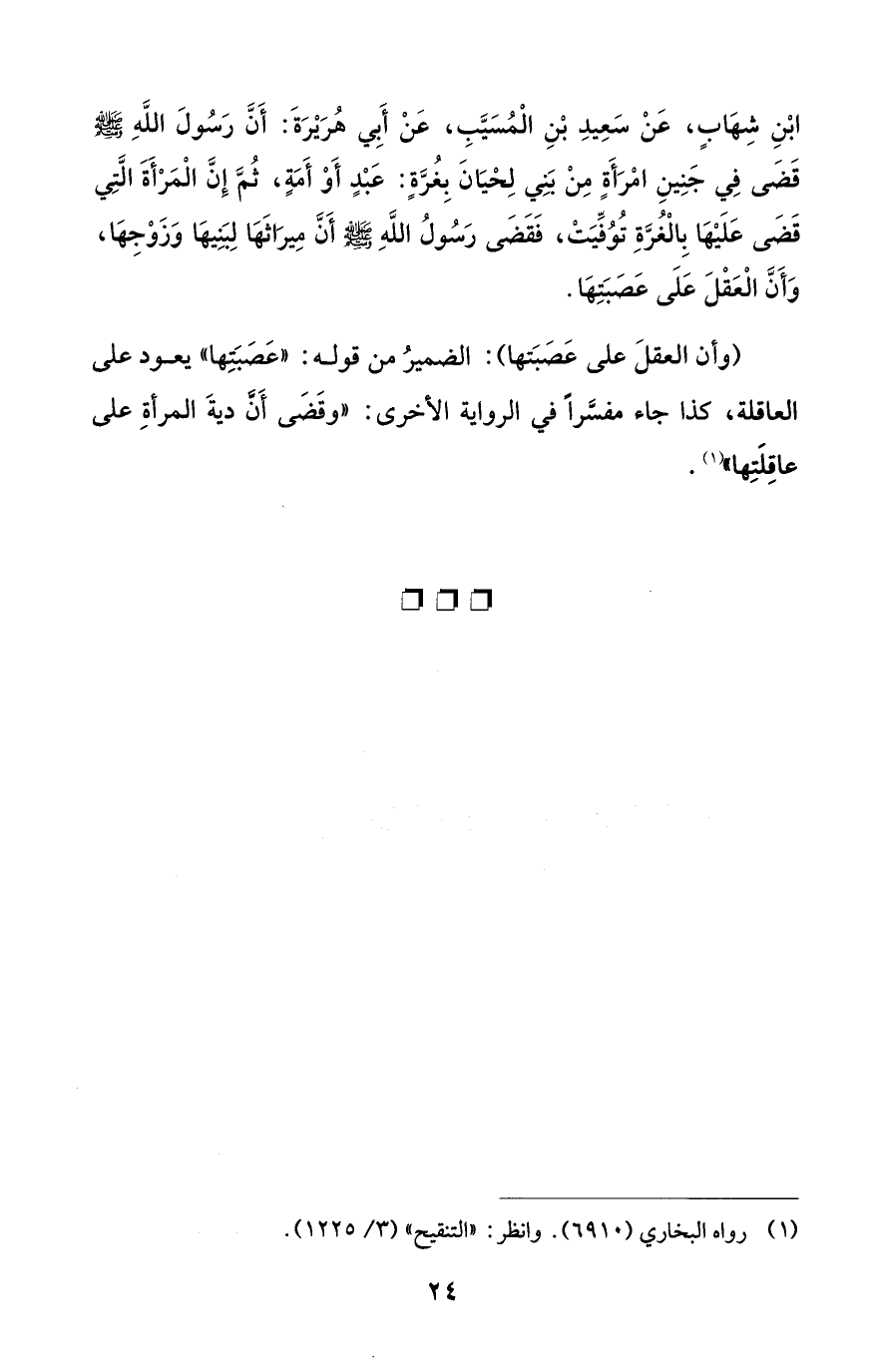 ابْنِ شِهَابٍ، عَنْ سَعِيدِ بْنِ الْمُسَيَّبِ، عَنْ أَبِي هُرَيْرَةَ: أَنَّ رَسُولَ اللهِ - صلى الله عليه وسلم - قَضَى فِي جَنِينِ امْرَأَةٍ مِنْ بَنِي لِحْيَانَ بِغُرَّةٍ: عَبْدٍ أَوْ أَمَةٍ، ثُمَّ إِنَّ الْمَرْأَةَ الَّتِي قَضَى عَلَيْهَا بِالْغُرَّةِ تُوُفِّيَتْ، فَقَضَى رَسُولُ اللهِ - صلى الله عليه وسلم - أَنَّ مِيرَاثَهَا لِبَنِيهَا وَزَوْجِهَا، وَأَنَّ الْعَقْلَ عَلَى عَصَبَتِهَا.