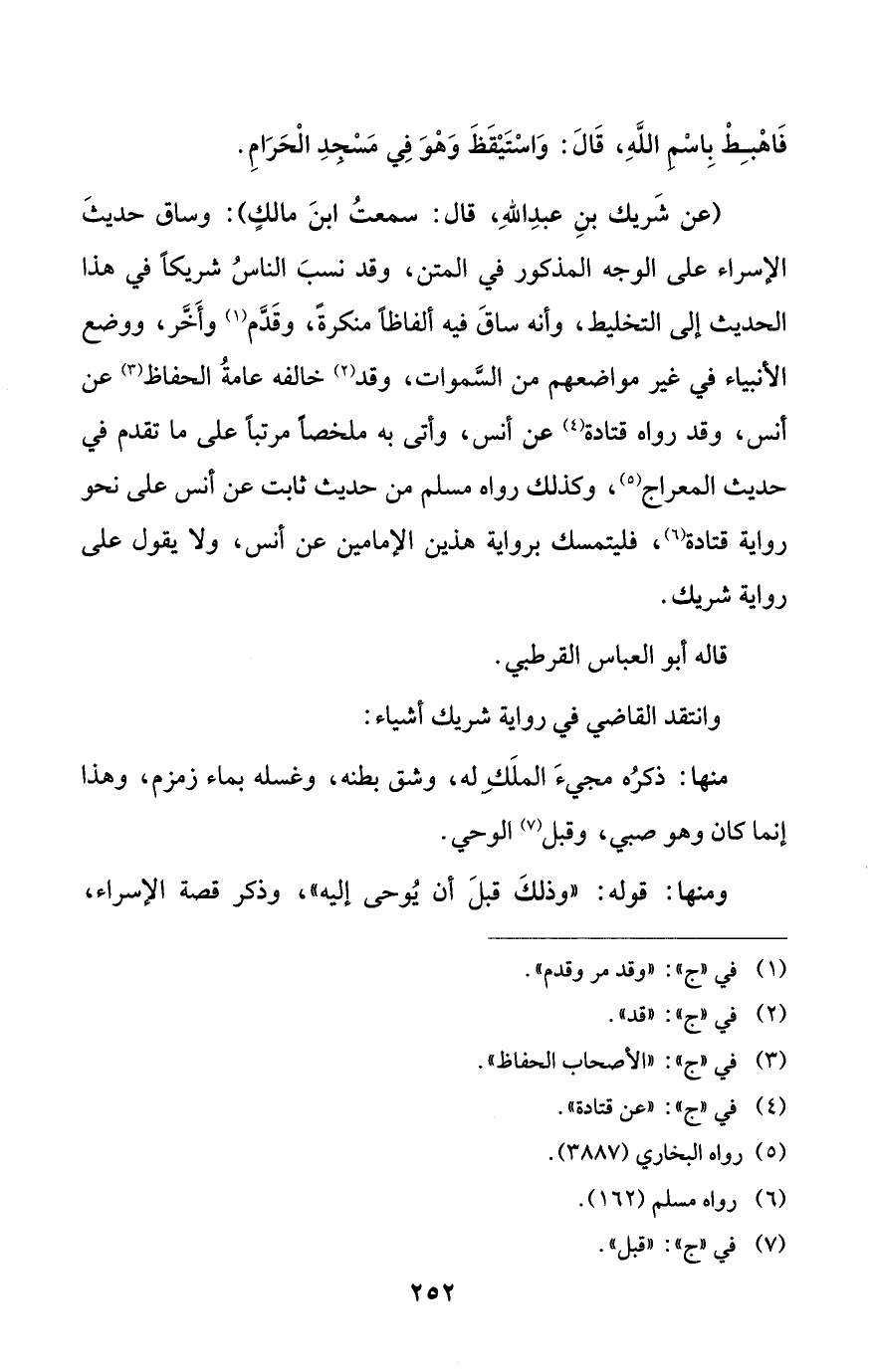 (عن شَريك بنِ عبدِ اللهِ، قال: سمعتُ ابنَ مالكٍ): وساق حديثَ الإسراء على الوجه المذكور في المتن، وقد نسبَ الناسُ شريكاً في هذا الحديث إلى التخليط، وأنه ساقَ فيه ألفاظاً منكرةً، وقَدَّم (¬1) وأَخَّر، ووضع الأنبياء في غير مواضعهم من السَّموات، وقد (¬2) خالفه عامةُ الحفاظ (¬3) عن أنس، وقد رواه قتادة (¬4) عن أنس، وأتى به ملخصاً مرتباً على ما تقدم في حديث المعراج (¬5)، وكذلك رواه مسلم من حديث ثابت عن أنس على نحو رواية قتادة (¬6)، فليتمسك برواية هذين الإمامين عن أنس، ولا يقول على رواية شريك.