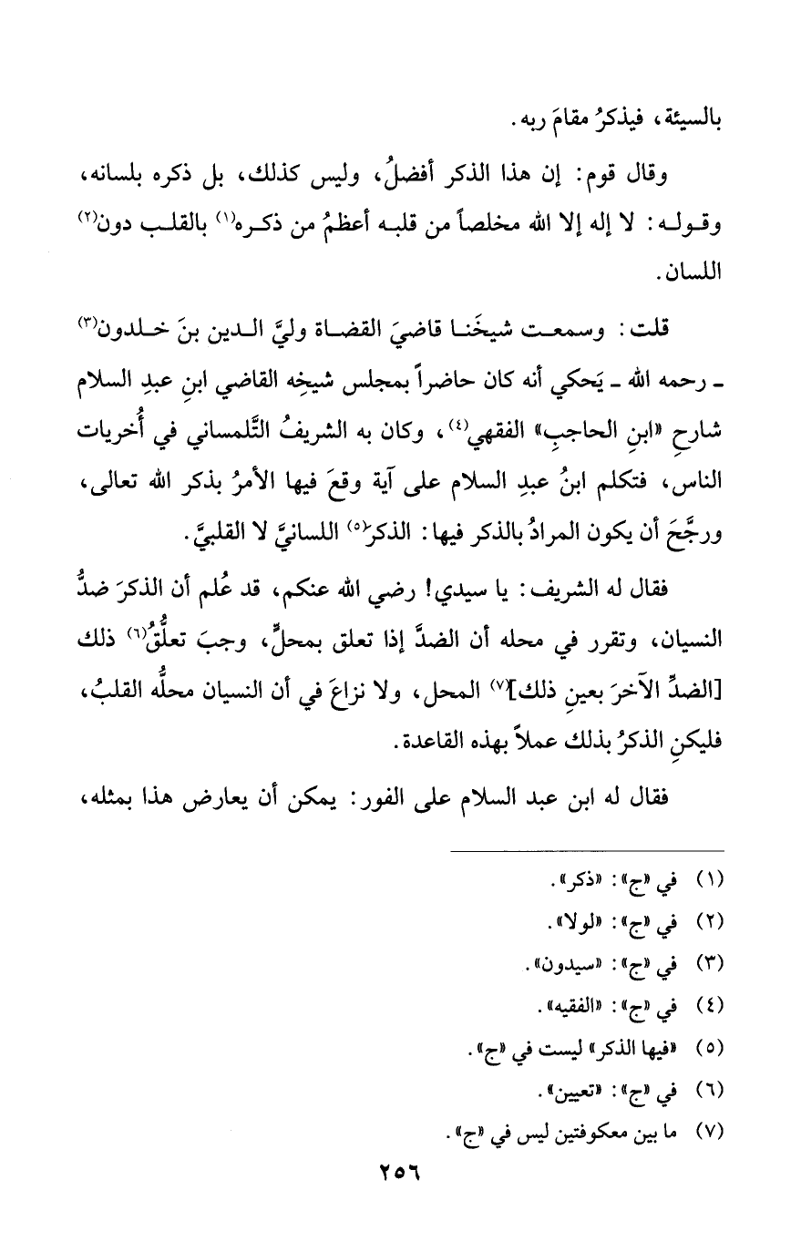 قلت: وسمعت شيخَنا قاضيَ القضاة وليَّ الدين بنَ خلدون (¬3) - رحمه الله - يَحكي أنه كان حاضراً بمجلس شيخِه القاضي ابنِ عبدِ السلام شارحِ "ابنِ الحاجبِ" الفقهي (¬4)، وكان به الشريفُ التَّلمساني في أُخريات الناس، فتكلم ابنُ عبدِ السلام على آية وقعَ فيها الأمرُ بذكر الله تعالى، ورجَّحَ أن يكون المرادُ بالذكر فيها: الذكرَ (¬5) اللسانيَّ لا القلبيَّ.